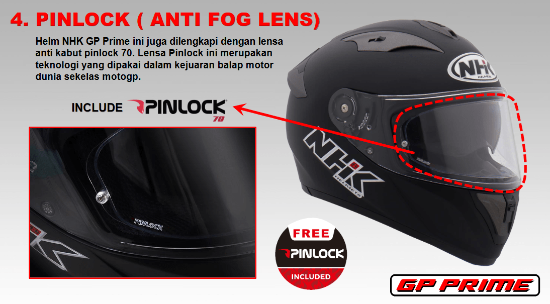 Tidak ketinggalan ada juga pinlock. Alias anti fog lens. Jadi kalian yang berkendara saat hujan atau cuaca dingin tidak perlu takut kaca berkabut. Apa lagi kalau kalian menggunakan helm NHK GP Prime. Karena helm ini sudah dilengkapi anti kabut Pinlock 70. Yang mana system ini sudah digunakan helm helm yang biasa digunakan oleh pebalap dunia sekelas pebalap MotoGP.