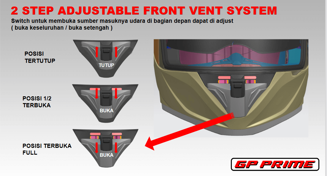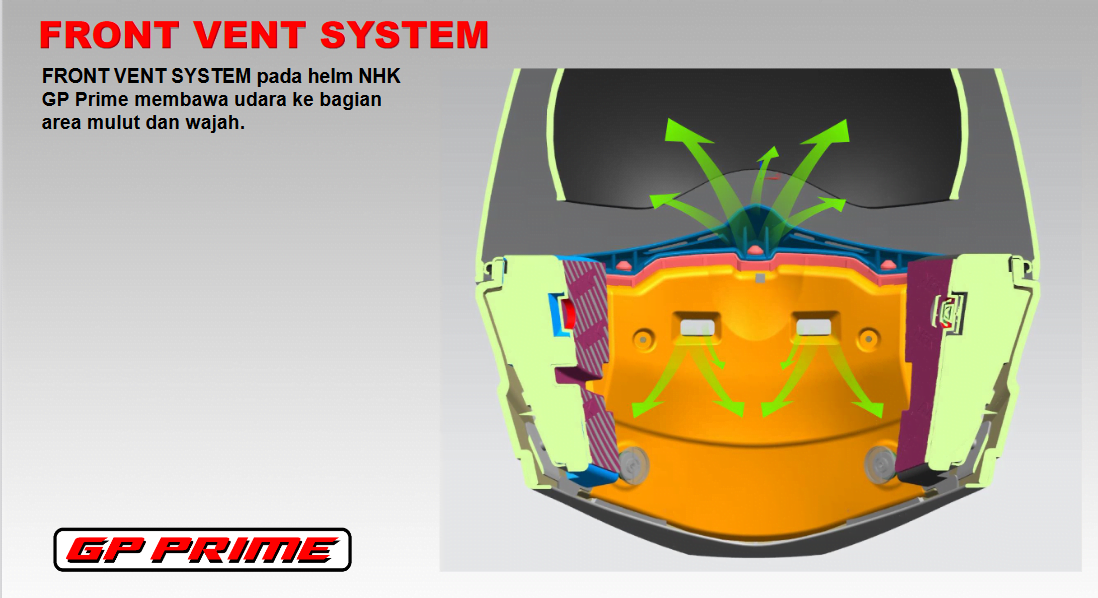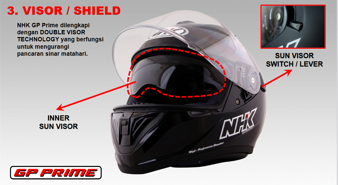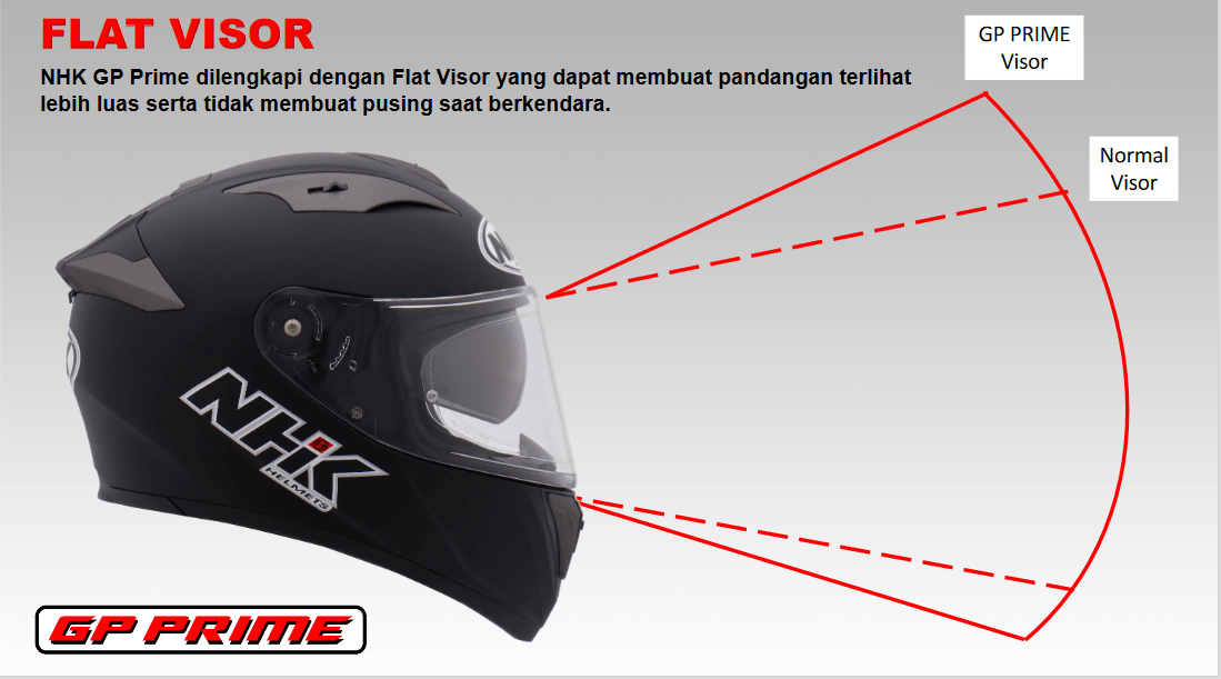 Itu dari bagian air vent system. Dari bagian Visor kalian tidak perlu khawatir. NHK selalu memberikan kalian kenyamanan pada visor. Untuk GP Prime ini hampir sama dengan motor balap. Kalian yang menggunakan helm ini akan dimanjakan dengan visor yang besar agar pandangan kalian bisa luas saat berkendara. Pastinya tidak berbahaya saat kalian berkendara dengan helm GP Prime.