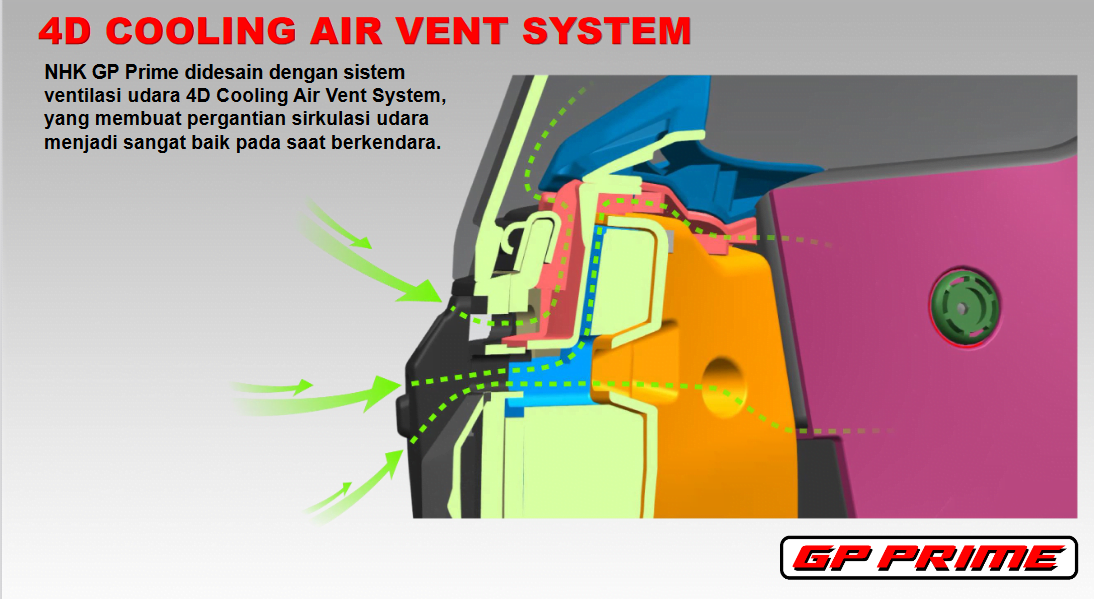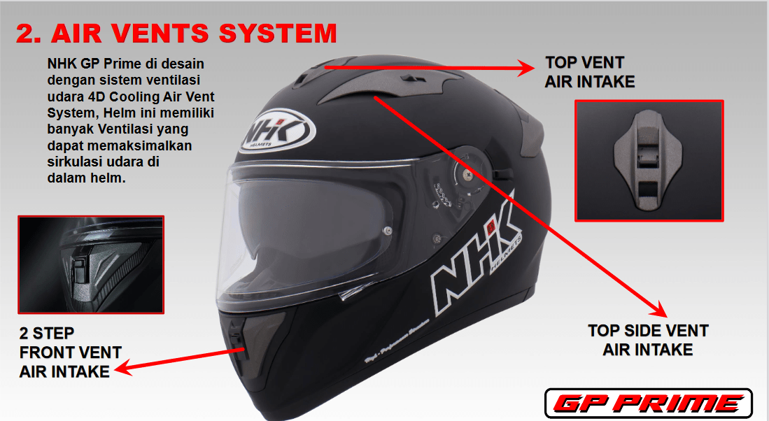 Itu baru sedikit dari banyak kelebihan dari helm GP Prime. Mau tau lagi? Ayo kita bahas lebih dalam. Ternyata kalian wajib tau kalau helm GP Prime ini memiliki lubang ventilasi udara sangat banyak. Alasan NHK memberikan banyak Ventilasi udara adalah untuk memaksimalkan udara masuk ke dalam helm dan dapat memberikan rasa lebih nyaman pada saat digunakan.
