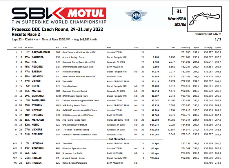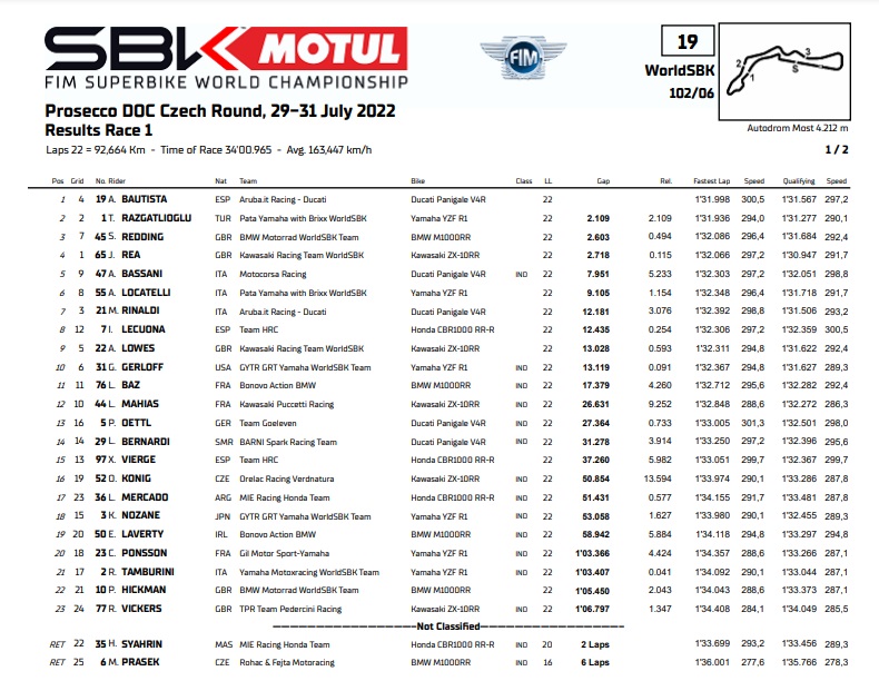 OtomotifZone.com-Ceko. Dua race WorldSBK di sirkuit Most, Rep. Cekoslovakia 30-31 Juli masih di kuasai para singa besar biasanya. Pada sirkuit yang tahun lalu sempat menuai protes tersebut berhasil mengantarkan Alvaro Bautista juara di race 1 dan Toprak Razgatlioglu juara di race 2. Dan pastinya masing-masing race ada cerita berbeda. Sirkuit Most kali ini sudah ada sedikit kerapian dan kehadiran penonton ada peningkatan di banding tahun lalu.