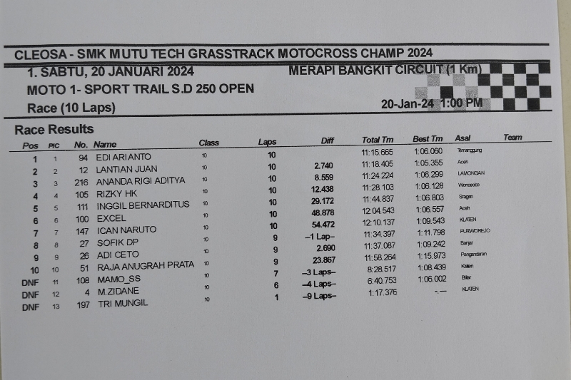 Namun dibalik semua itu terbayar lunas, Edi di musim balap 2024 kini fix balap full penuh bersama team AKRM – Akar Mas Racing Division menuai hasil positif, pastinya ada banyak harapan, terbukti pada kelas Sport Trail 250cc moto 1 Event SMK Mutu Tech Grasstrack Motocross Merapi Bangkit Magelang hari Sabtu, 20 Januari 2024 Edi berhasil menang.