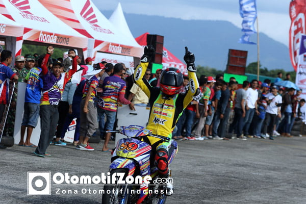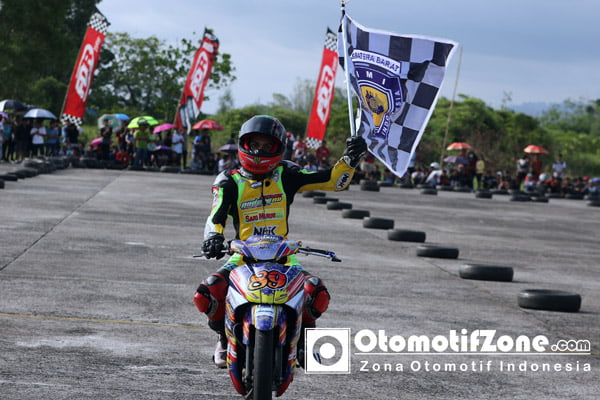 Pembalap Riau asal Suhandi Padang 88 racing team sari murni melejit sendirian tanpa ada satupun pembalap yang dibelakangnya mengganggu hingga bendera finish dikibarkan, meski Becky terus mencoba merangsek kembali dan Reggi Lukman asal Canasta rbrt nhk irc ohlins ahrs arya 11 juga mulai menendekat namun lap tersisa tidak mampu mengejar ketertinggalan.