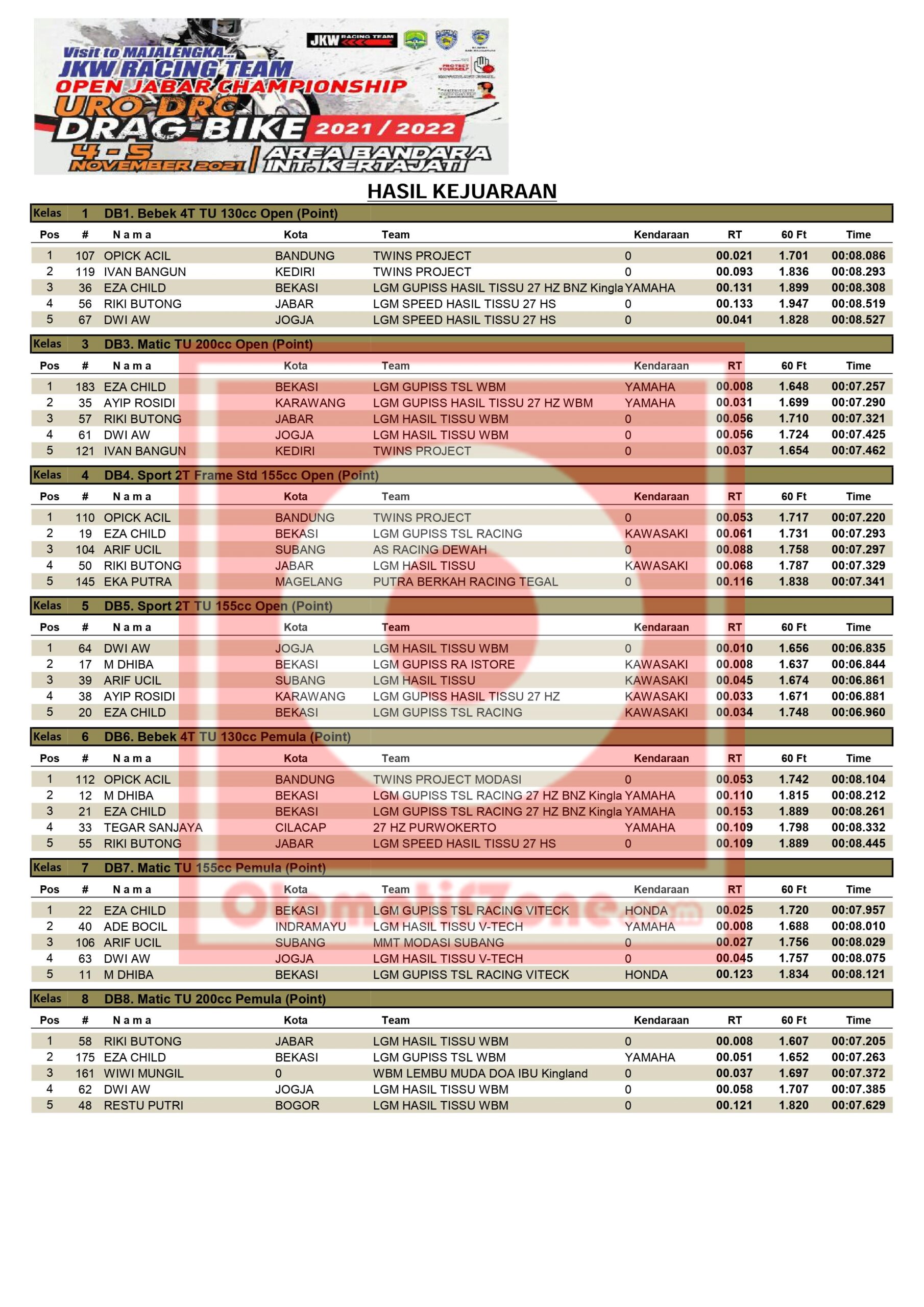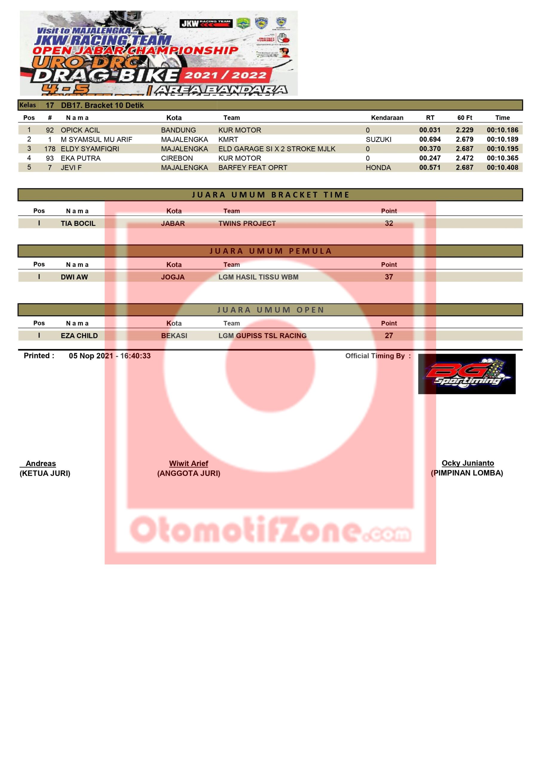 Otomotifzone.com – Bandung. Telah usai pagelaran drag bike milik URO dalam tajuknya URO DRC Drag Bike JKW Racing Team Open Jabar Championship 2021 yang berlangsung pada Sirkuit NP area Bandara Internasional Kertajati, Majalengka. Hanya berlangsung satu hari (5/11/2021) balap lurus roda dua, langsung selesai dilaksanakan sehari sekaligus.