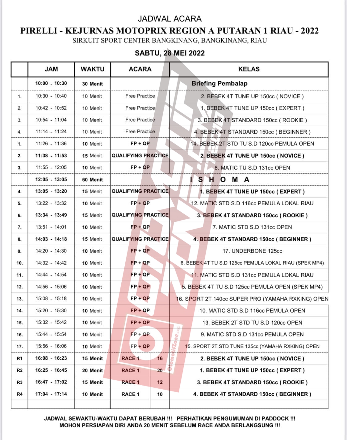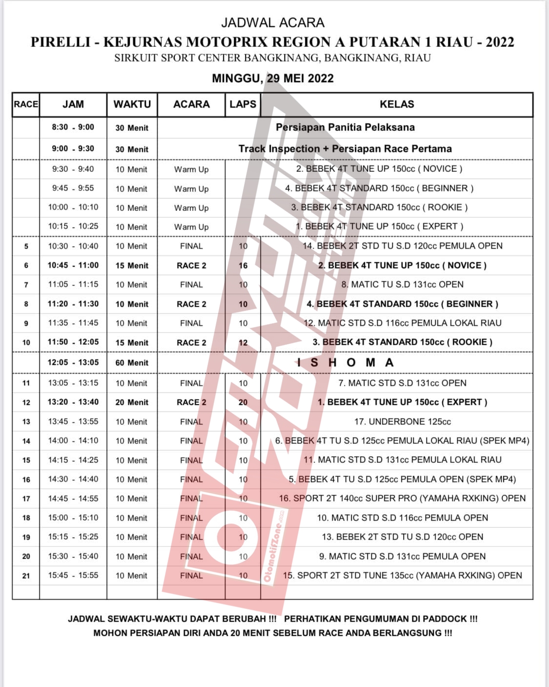 Lalu untuk hari kedua atau hari Minggu (29/5), panitia sudah menyusun semua jadwal. Kelas Kejurnas akan menjalankan sesi Warm Up serta Race 2. Sedangkan untuk kelas kelas Supporting akan menyajikan partai final. Lalu kira kira siapa yang akan menjadi juara dikelas kelas yang dilombakan? Tunggu kabar beritanya hanya di OtomotifZone.com