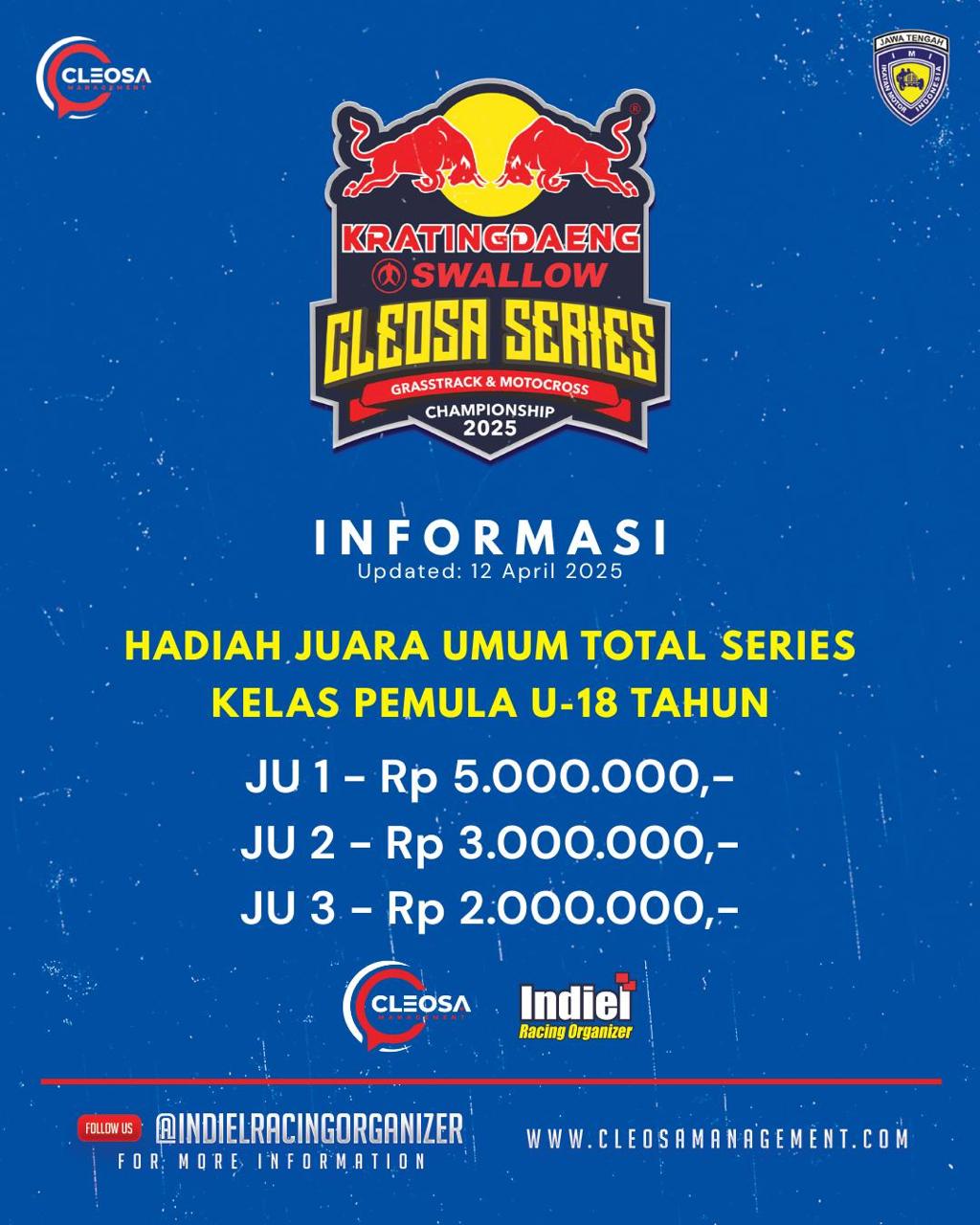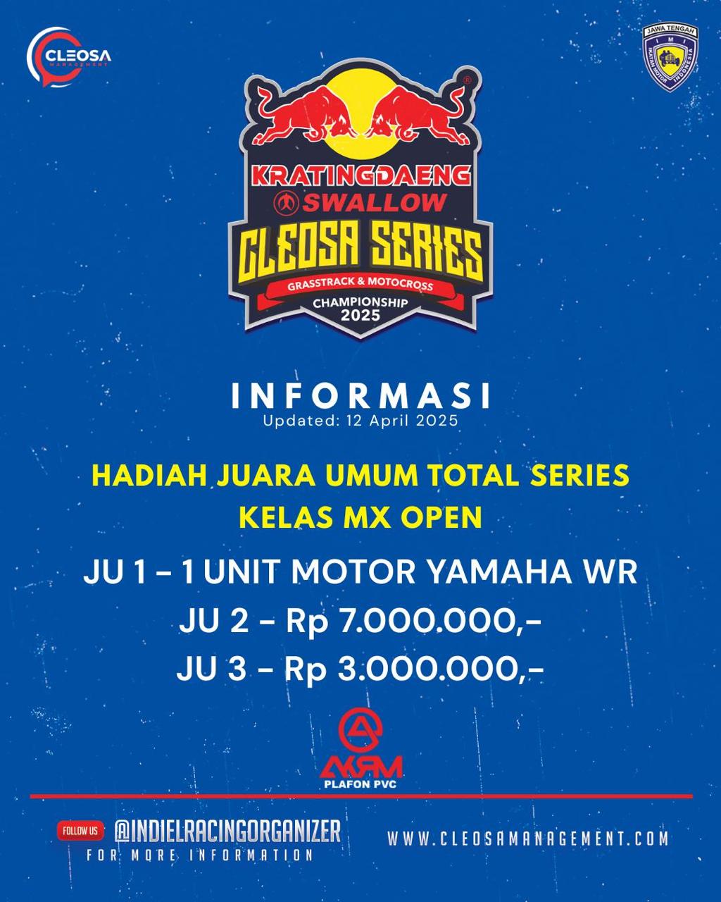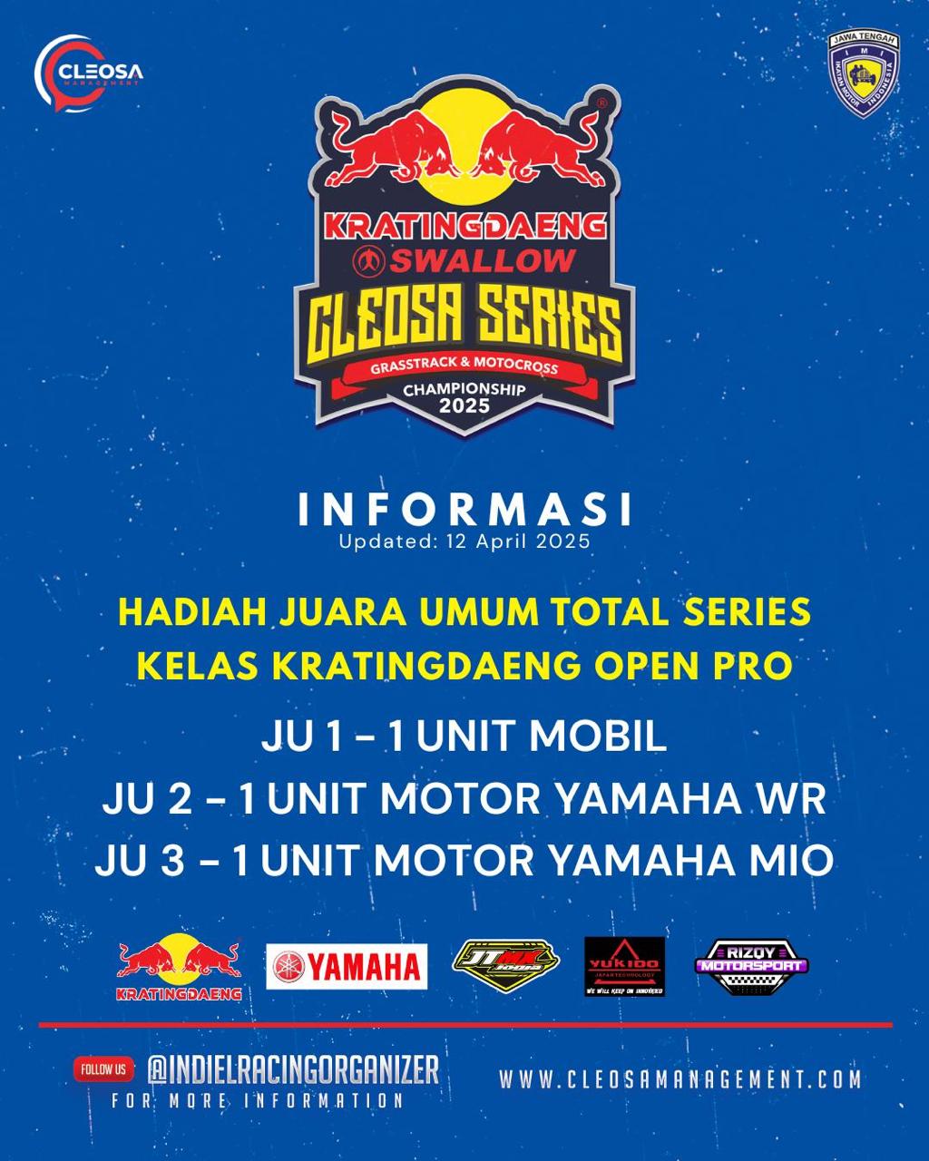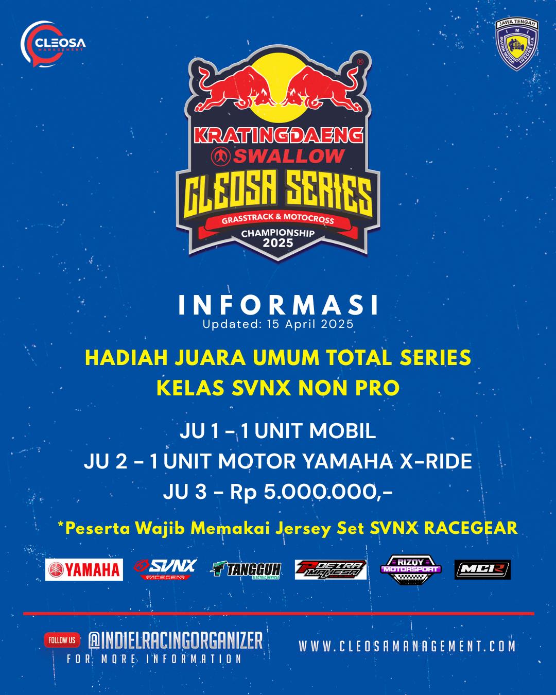Di gandeng Kratingdaeng, Swallow dan SVNX serta sponsor pendukung yang ikut mensupport puluhan hadiah mewah ini akan mewarnai event cleosa series 2025 semakin berwarna. Sudah bisa di prediksi khusus kelas grasstrack baik Pro dan Pemula ada persaingan sulit dari tiga kelas point penting berhadiah mobil.