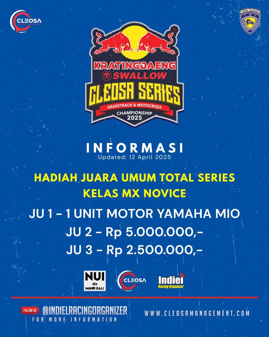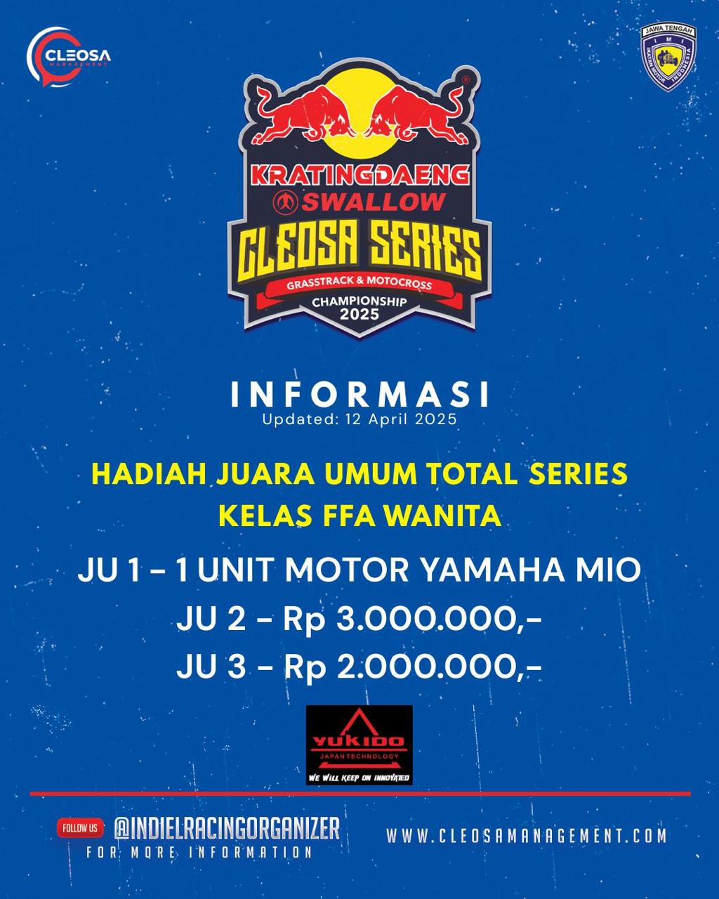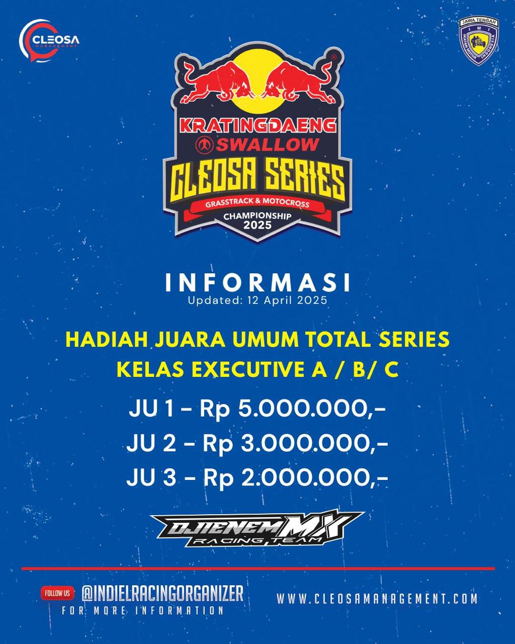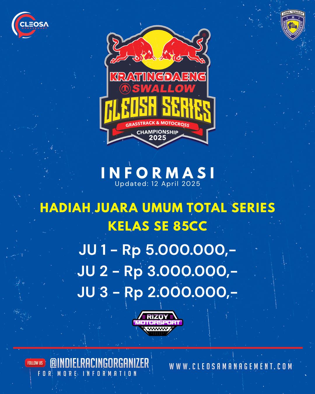 Di gandeng Kratingdaeng, Swallow dan SVNX serta sponsor pendukung yang ikut mensupport puluhan hadiah mewah ini akan mewarnai event cleosa series 2025 semakin berwarna. Sudah bisa di prediksi khusus kelas grasstrack baik Pro dan Pemula ada persaingan sulit dari tiga kelas point penting berhadiah mobil.