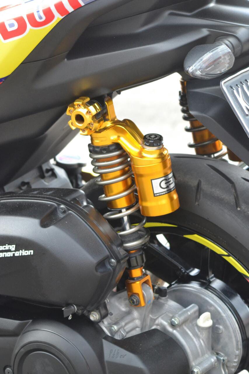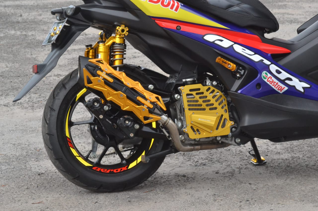 Biar makin pas dengan konsepnya, beberapa parts detail ala racing dipasangkan. Ajrutan depan ganti sokbeker model upside down merk Ride-it, lalu sok belakang dari produk Gen model tabung. Dari sini bikin Aerox jadi makin tampak kekar dan berotot.