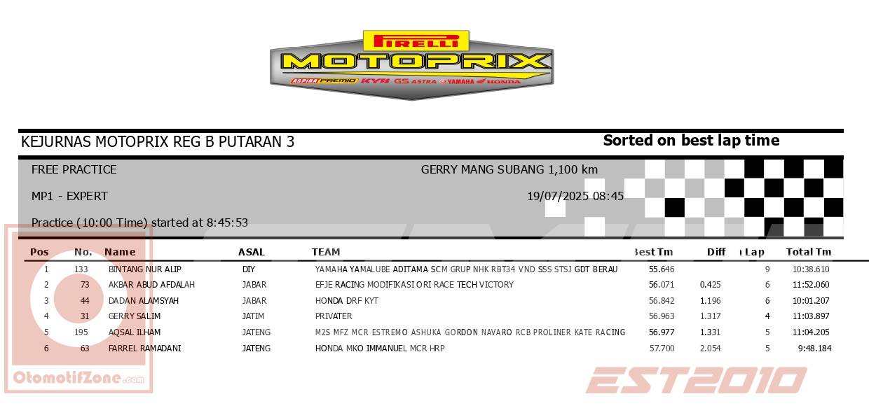 Langkah impresif Bintang Nur Alip di sesi latihan ini tentu membuka peluang besar baginya untuk mendominasi jalannya balapan. Mampukah ia mempertahankan performa ini hingga race day? Kita nantikan aksinya di lintasan Sirkuit Gerymang Subang.