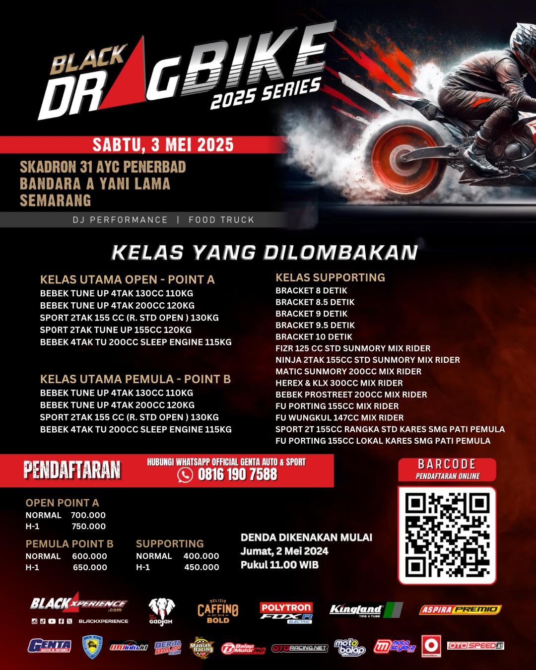 So, rugi banget kalau kalian sampai ngga pada datang di Black Dragbike 2025 Series, 3 Mei 2025 mendatang di Sirkuit Skadron 31/AYC Bandara A Yani Lama, Semarang, buruan daftarkan diri anda ke https://drag.daftargentaautosport.com/ atau hubungi official whatsapp Genta Auto Sport 08161907588 dan catat tanggal mainnya yaa.