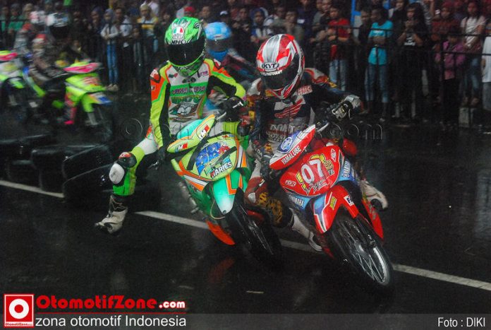 Tepat siang bolong tiba – tiba hujan turun dan sangat lebat. Namun para pembalap terutama di Seeded tetap gaspol meski trek licin terutama di putaran balik R 1,3 dan 5. Kondisi ini dimanfaatkan para racer yang piawai di trek basah. Di Mp1 pebalap Tommy Salim yang kini bergabung di Putra Anugrah Racing sukses bersaing lawan Faisal Baharudin. Rekan se tim Tommy yakni Aldhila Eka Darma mengendarai Jupiter Z1 nya ganti kuasai trek di Mp2.