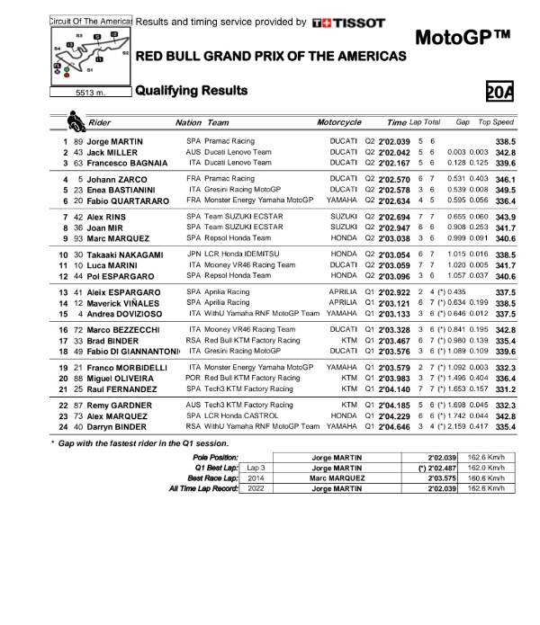 OtomotifZone.com-Amerika. Luar biasa hasil kualifikasi MotoGP di sirkuit Austin, Amerika pada seri 4 MotoGP 2022. Kualifikasi kemarin (9/4) merupakan kualifikasi bersejarah lagi bagi gelaran terbesar balap motor di dunia tersebut. Bagaimana tidak, posisi satu sampai lima di borong pembalap penunggang Ducati. Sesuatu yang jarang terjadi sejak mereka hadir 2003 silam.