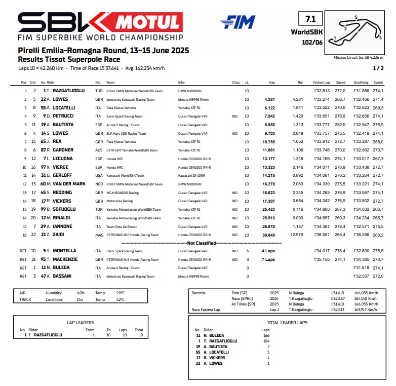 Balap sebelum Race 2 yakni Superpole Race tak ada pertarungan sengit antara keduanya. Karena apa? Bulega dapat kejutan pahit atas tergelincirnya Axel Bassani di tikungan pertama setelah start. Toprak langsung memimpin dan tak ada yang bisa melawannya selama 10 lap sampai garis finish.