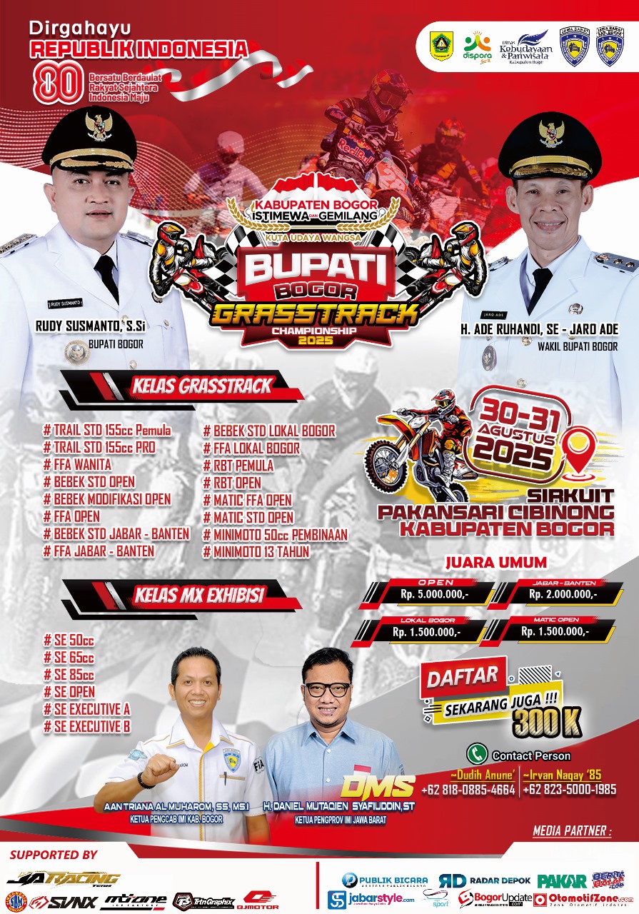 OtomotifZone.com – Bogor. Gelaran balap tanah bergengsi siap digelar di Kabupaten Bogor lewat ajang Bupati Bogor Grasstrack Championship 2025 dengan tema “Kolaborasi Menuju Prestasi Gemilang”. Event ini akan berlangsung pada 30–31 Agustus 2025 di Sirkuit Pakansari, Cibinong – Kabupaten Bogor.