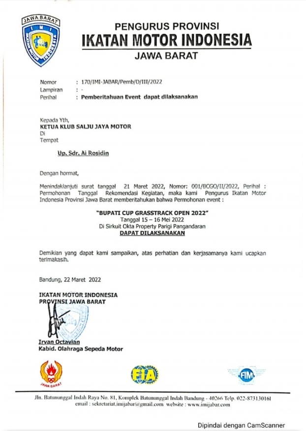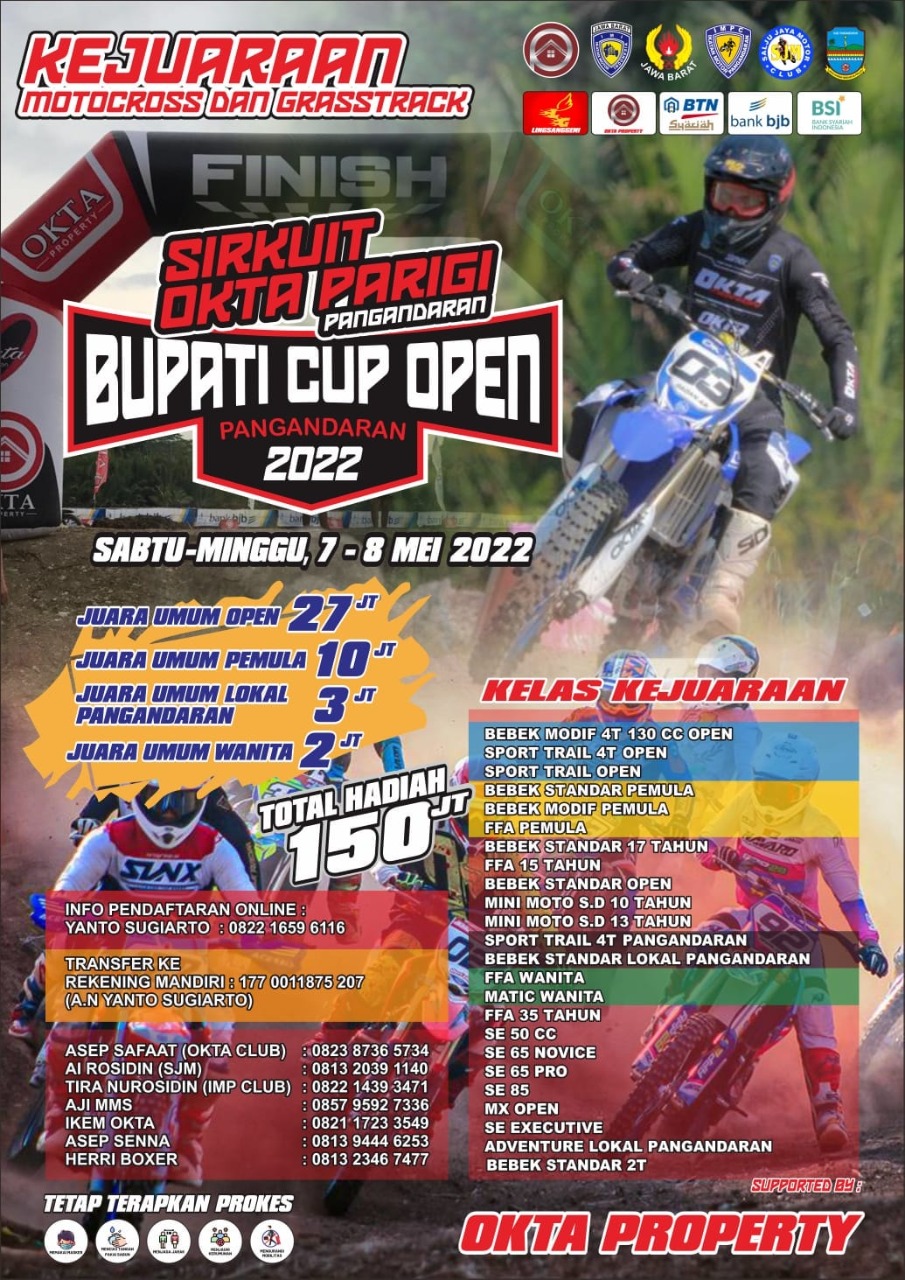 Panitia mengukuhkan waktu yang tepat yakni (7-8/5/2022), tetap dengan Sirkuit Okta Parigi – Pangandaran, Jawa Barat. Sebagai lokasi pelaksanaan balapan Motocross dan Grasstrack. Ini pun sudah mendapat surat izin sekaligus rekomendasi pelaksanaan yang kian membuat kuat, dari acara pelaksanaan. Jadi engga usah ragu dan takut lagi yaa.