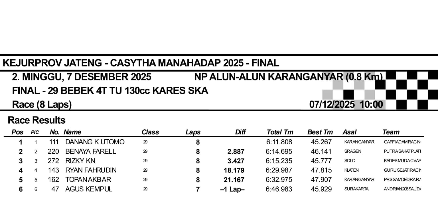 Aksi cepat dan bersih ini langsung mengubah peta persaingan. Setelah memimpin, Danang K. Utomo melesat tak terbendung dan berhasil mengunci kemenangan, menggarisbawahi dominasinya di sirkuit “pasar senggol” Alun-Alun Karanganyar. Kemenangan ini menjadi sinyal kuat bahwa Danang K. Utomo adalah rising star yang patut diperhitungkan di kancah balap regiona.