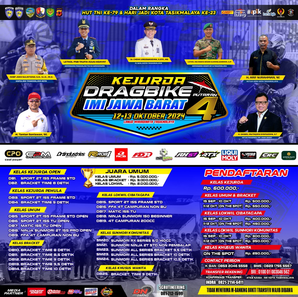 OtomotifZone.com – Bandung. Gelaran Kejuaraan Daerah ( Kejurda) Drag Bike IMI Jawa Barat akan berlangsung (12-13/10/24) di Sirkuit Lanud Wiriadinata, Tasikmalaya, Jawa Barat. Pada gelaran ini kelas kelas bergengsi akan membuat event ini semakin memanas. Pasalnya pada gelaran Kejurda nanti diprediksi pebalap pebalap papan atas Nasional akan ikut serta dalam gelaran bergengsi ini.