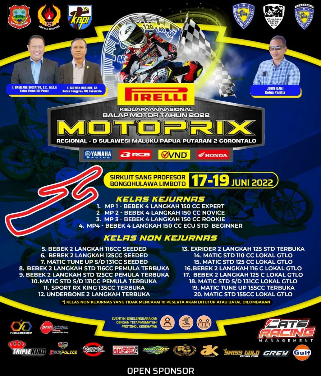 OtomotifZone.com – Gorontalo. Hello kalian semua peserta Kejurnas Motoprix Region D pasti sudah tidak sabar menanti kabar berita ini. Ya, Kejurnas Motoprix Region D akan kembali digelar. Kali ini putaran kedua akan digelar (17-19/6/22) di Sirkuit Sang Profesor Bongohulawa Limboto, Gorontalo. Putaran kedua pastinya akan sangat panas. Karena point putaran pertama masih acak. Semua peserta masih memiliki kesempatan besar.