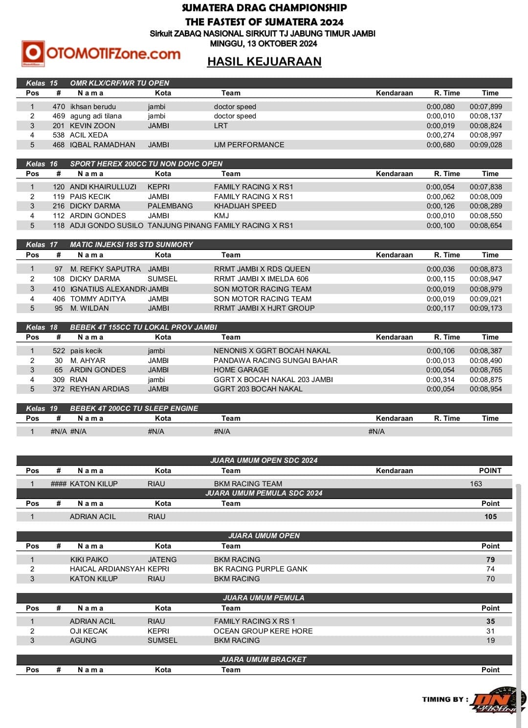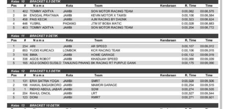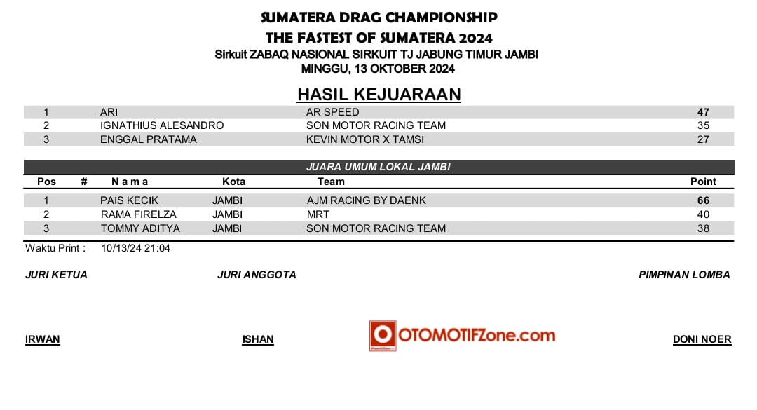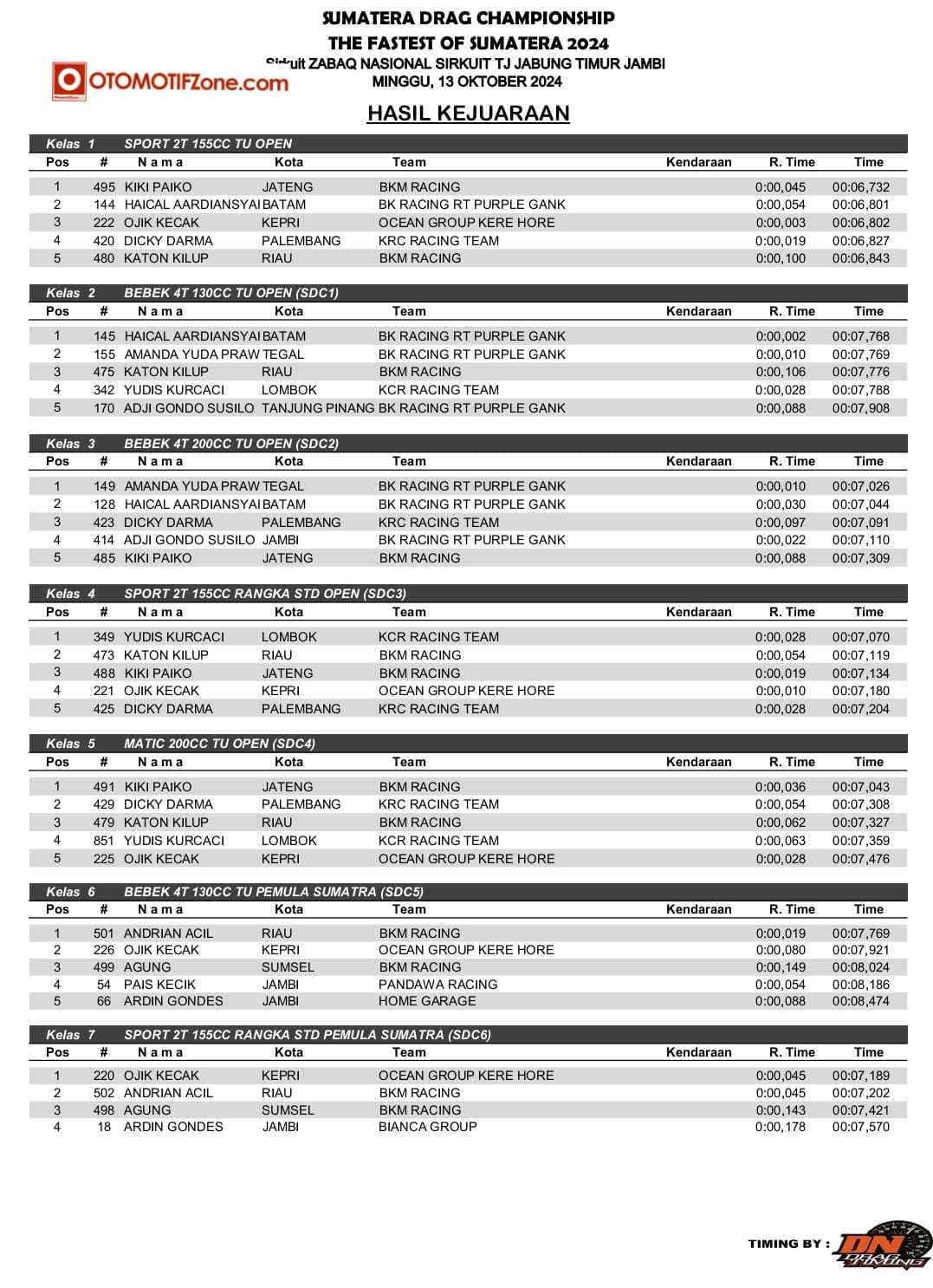 OtomotifZone.com – Jambi. ” Gile Bener” peserta memadati gelaran Sumatera Drag Championship 2024 yang berlangsung (13/10/24) di Zabaq Nasional Sirkuit, Jambi. Catatan waktu luar biasa ditorehkan pebalap. Dan waktu yang fantastis tercipta pada setiap kelas yang dilombakan. Berikut hasil lombanya: