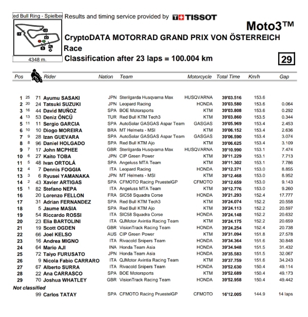 “Saya tidak pernah menyerah! Di Silverstone saya membuat kesalahan. Itu salah saya dan ini momen sulit karena penalti. Saya datang ke sini tau bahwa saya harus melakukan penalti dan mengetahui bahwa saya seharusnya lebih baik dari orang lain. Saya memiliki sikap yang baik untuk bekerja sepanjang akhir pekan dan memiliki kecepatan yang luar biasa. Untungnya balapan berlangsung kering dan saya tidak melakukan kesalahan. Lap terakhir saya sangat fantastis. Terima kasih semua. Saya berharap di GP berikutnya kami bisa mencapai puncak klasemen.” kata Sasaki yang baru bergabung di team Sterilgarda Husqvarna Max Racing Team.