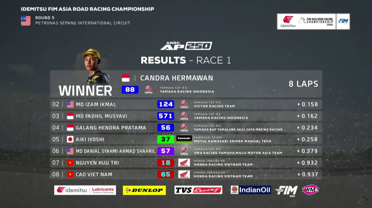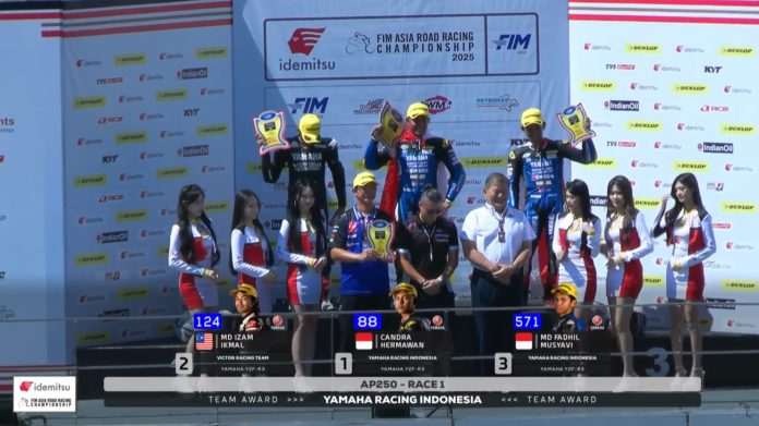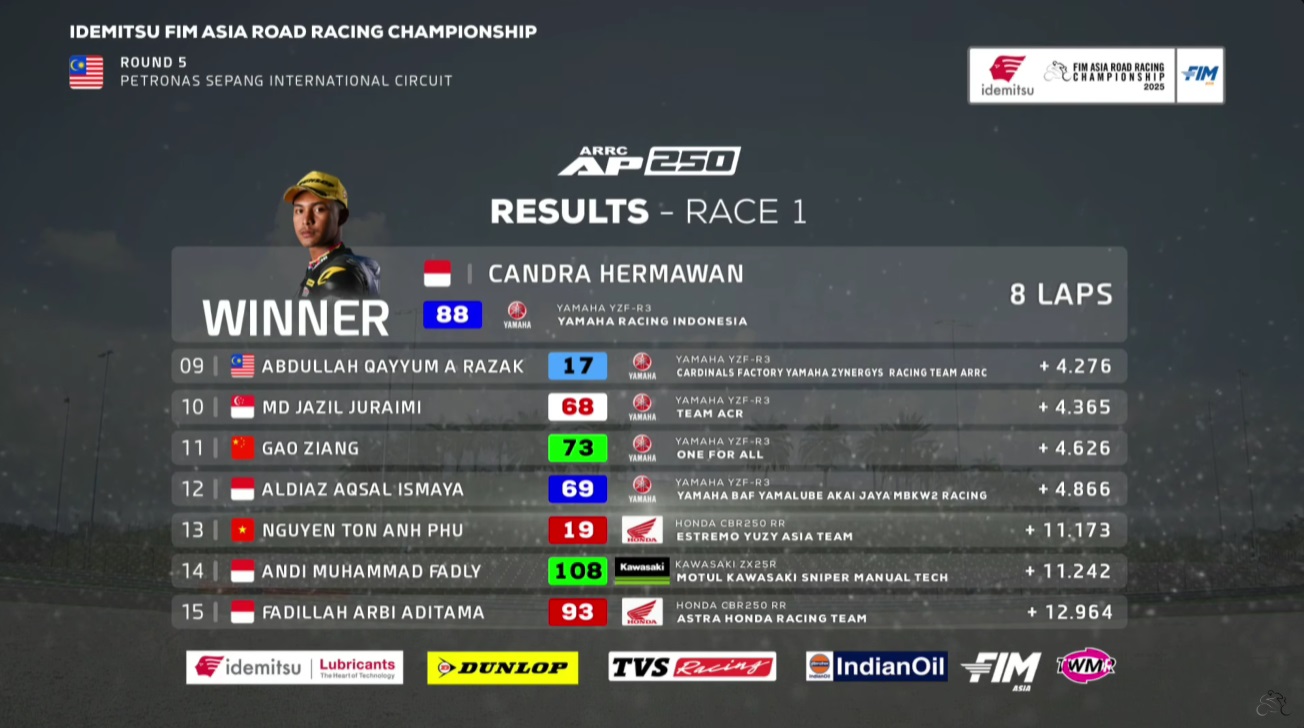 OtomotifZone.com – Malaysia. Race pertama kelas AP250 Asia Road Racing Championship sirkuit Sepang Malaysia 11 Oktober 2025 tentu menjadi kelas yang tak kalah sengit pertarungan rapatnya. Murobbil Vitoni kembali start terdepan di Sepang setelah di Mandalika kemarin dirinya juga tampil sebagai poleman. Tapi jangan salah sangka pertarungan kelas AP250 ini adalah pertarungan tak biasa karena rapatnya bukan main pergantian antar pembalap setiap lapnya.