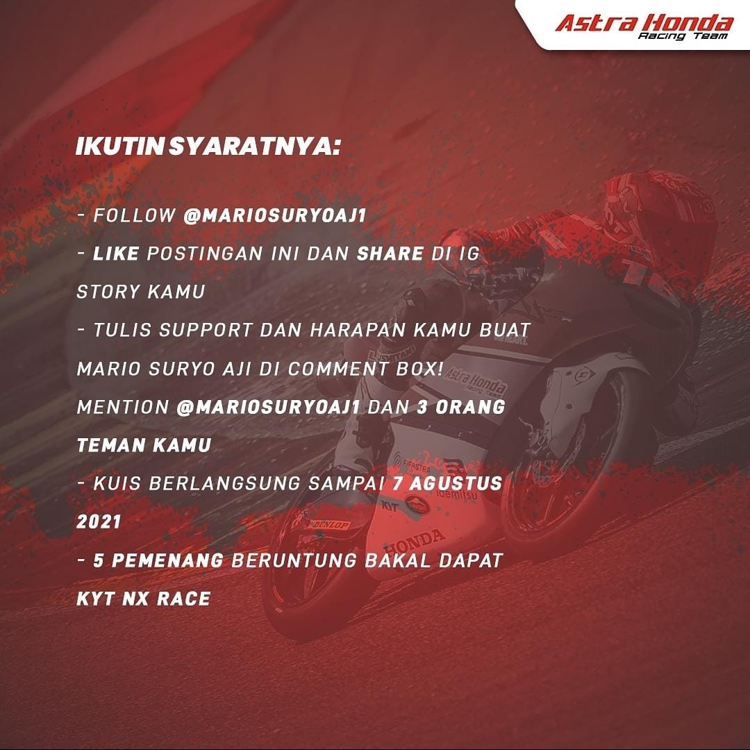 “Yuk ikutan kuisnya Gaeees! Jangan lupa cek syaratnya di slide terakhir ya. Tulis support kalian untuk @mariosuryoaj1 dan harapan untuk dia dimasa depan di comment box. Ajak teman kamu buat ikutan juga ya! Ayo tunggu apalagi dapatkan hadiah menarik ini hanya cuma-cuma. Gas jangan sampe kelewatan ya!,” jelas akun Astra Honda Racing Team.