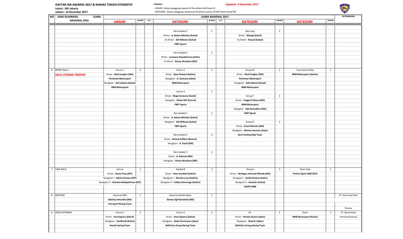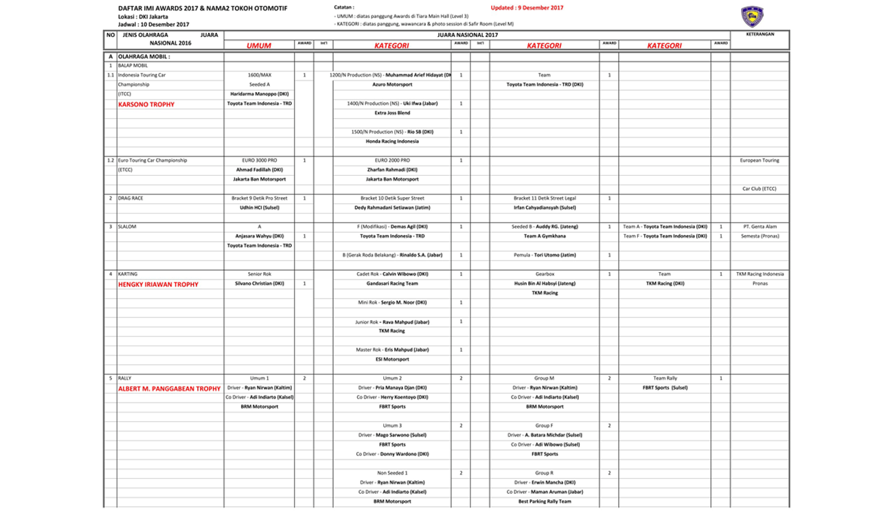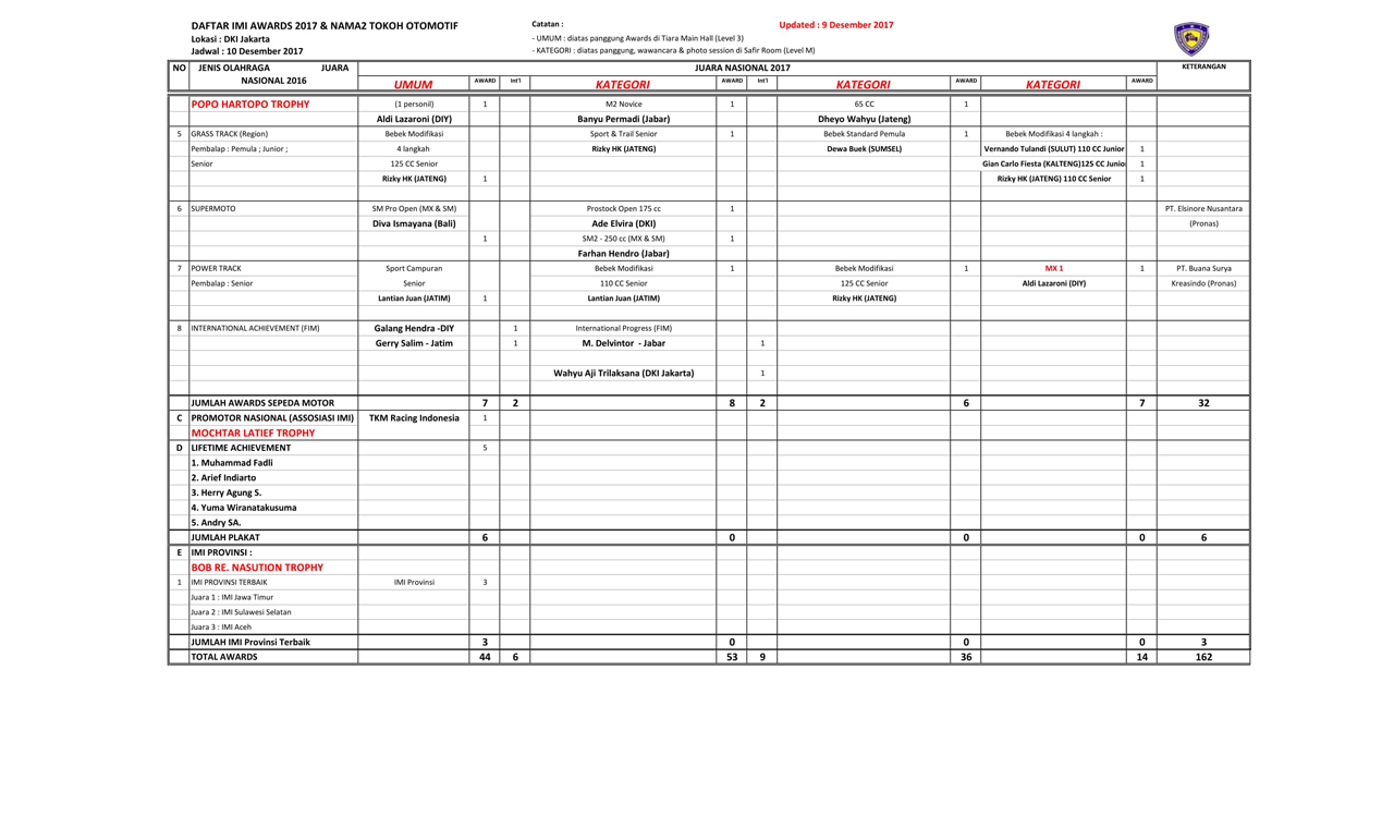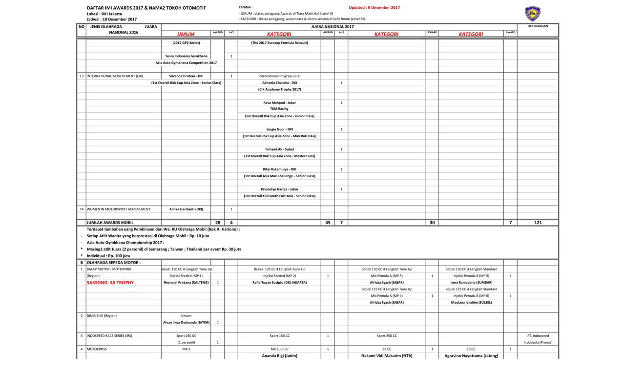 Terkait hal tersebut, Ikatan Motor Indonesia (IMI) sebagai induk olahraga otomotif di Indonesia, mengumumkan dan memberikan penghargaan kepada pebalap yang berpertasi selama satu tahun ini. Malam Awarding tersebut berlangsung Minggu, 10 Desember 2017, bertempat di Crowne Plaza Hotel, Jakarta.