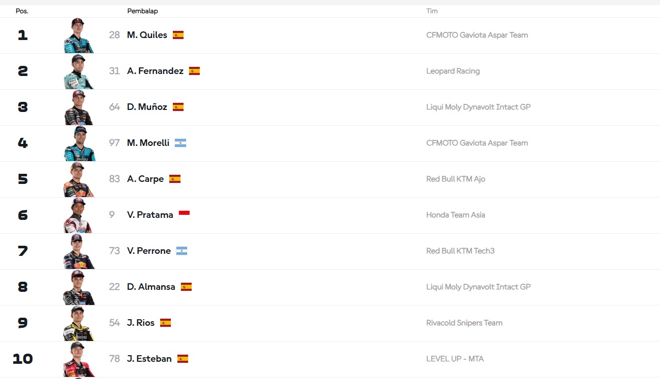 start dari posisi 17 veda membuat serangan gila. Melawan pasuka KTM yang mendominasi pertarungan tak membuatnya ciut. rombongan Veda ada di rombongan kedua. Lebih ketat dari rombongan pertama. Akhirnya Veda bisa meloloskan diri dan memisah meski dia bertempur di urutan 5-6.