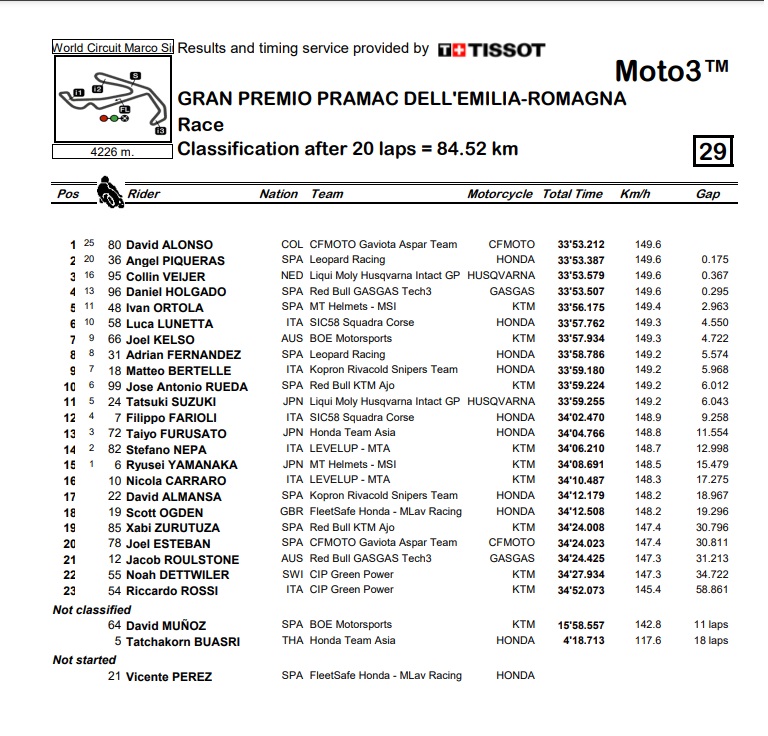 Pertarungan sengit makin menjadi setelah pembalap Husqvarna Collin Veljer mendekat. Dan akhirnya di kisah balap pertarungan bersih David Alonso unggul dari Dani Holgado. Apes bagi Hlgado karena batal finish ke urutan 2. Ban motornya menginjak track limit. Berkah bagi Veljer naik posisi ketiga race kali ini. Furusato finish ke 13.