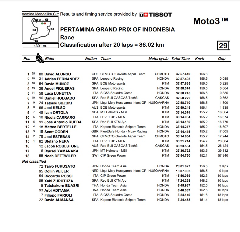 OtomotifZone.com – Lombok. Race Moto3 sirkuit Mandalika, Lombok, Nusa Tenggara Barat 29 September 2024 mungkin menjadi race terpanas. Dalam konteks panas cuaca juga persaingan sepanjang race. Selepas start dalam sekejap terfokus sepuluh pembalap terdepan. Mereka bergerombol bak gerbong kereta.