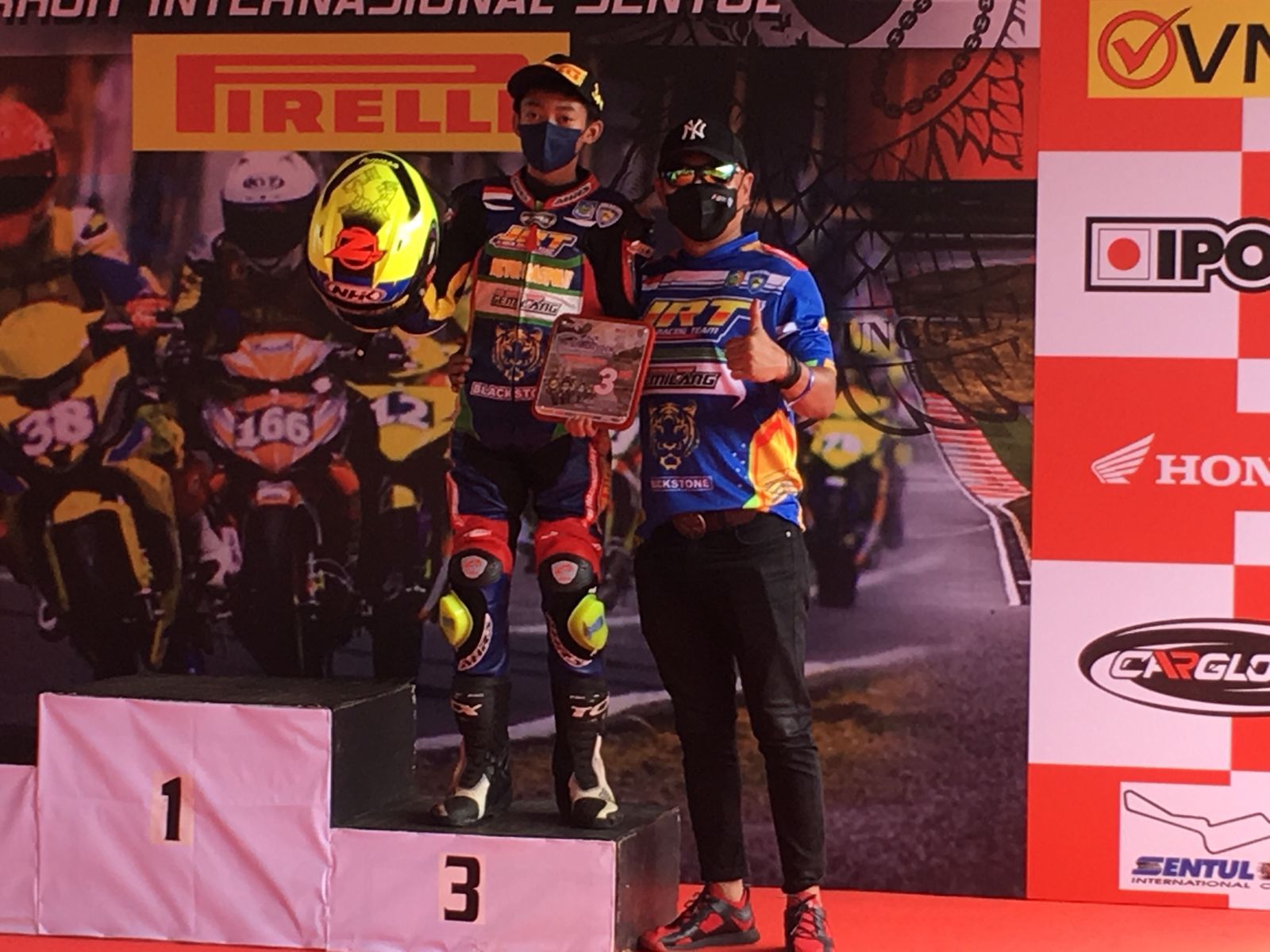“Aska coba fokus dan push terus Mas, Alhamdulillah race 2 bisa finish posisi 3 dan cukup puas soalnya ini perdana Aska balap di Sentul besar”. Ujar Aska