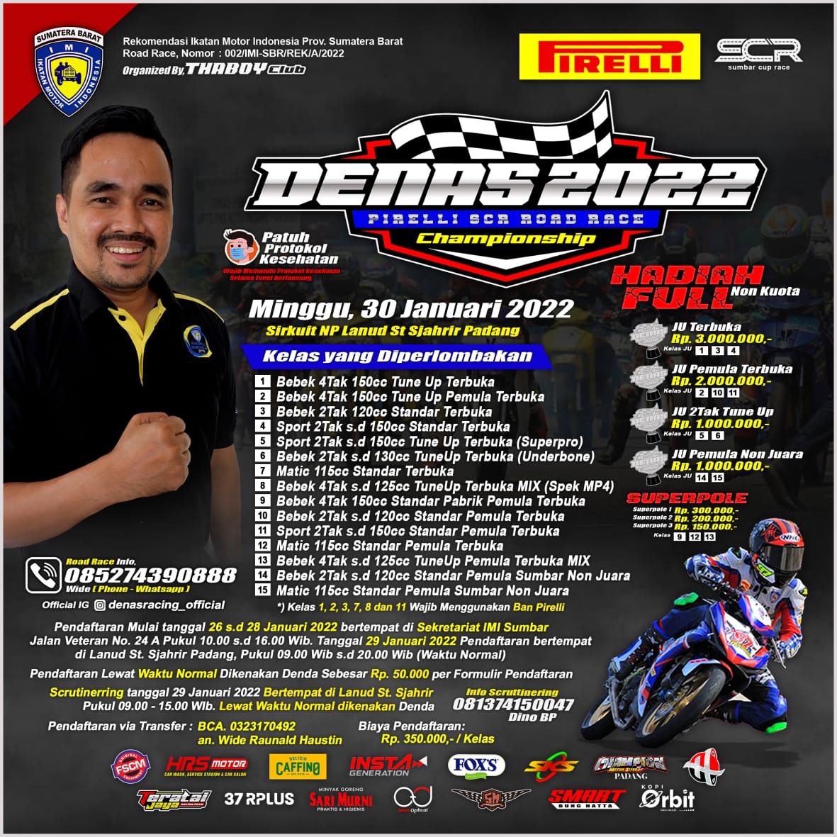 Bertajuk Pirelli Denas SCR Road Race Championship 2022, akan menjalankan sebanyak 15 kelas perlombaan balap motor road race. Perihal hadiah ajang balap motor Sumatera Barat ini bukan kaleng-kaleng. Pihak panitia akan memberikan hadiah full non kuota bagi para pemenang yang berhasil podium.