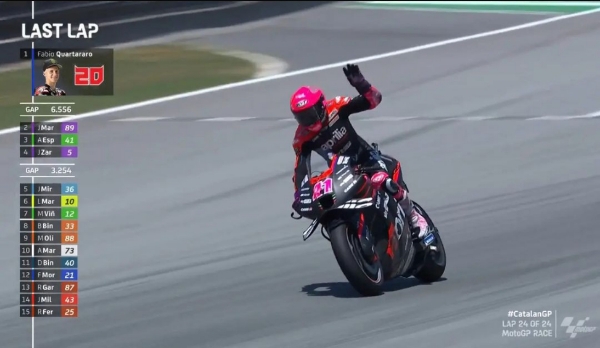 Tapi apa yang terjadi wahai Aleix. Bendera belum berkibar tapi dia sudah selebrasi melambaikan tangan. Melihat Luca Marini yang masih tancap gas di R3 dia kaget. Rupanya belum final!! Sial Aleix melorot ke posisi 6!!! Beberapa staf Aprilia gemas melihat kejadian tersebut. Jalan satu-satunya adalah overtake Luca Marini agar bisa finish kelima.