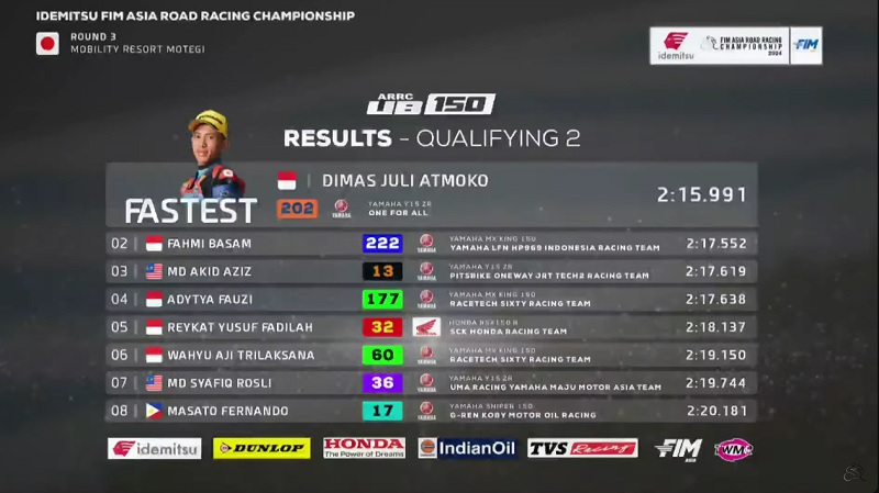 OtomotifZone.com-Jepang. 8 Juni 2024 pagi sesi kualifikasi Asia Road Racing Championship (ARRC) untuk kelas Underbone 150cc Motegi, Jepang di mulai. Salah satu sorotan utama dalam sesi kualifikasi kali ini adalah tetap memantau pergerakan pembalap Indonesia. Dimas Juliatmono, pembalap asal Berau, Kalimantan Timur, yang berhasil mencatat waktu tercepat.