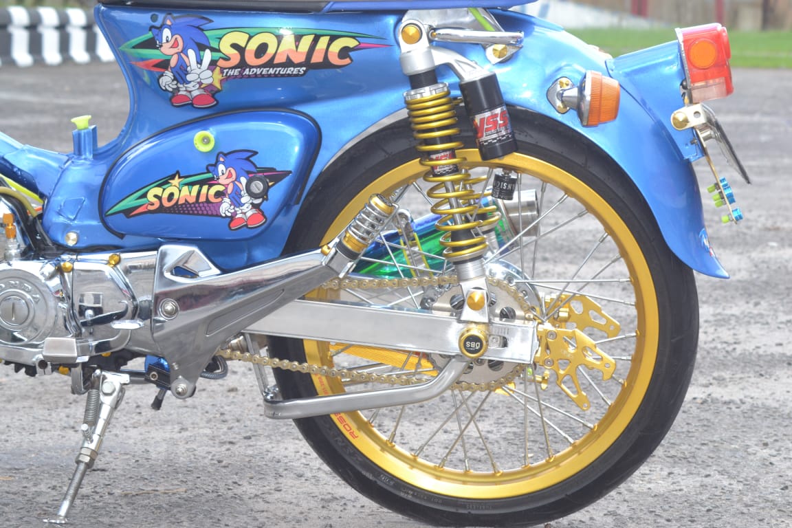 Pada kedua bagian peredam kejutnya, ganti dengan variasi. Yaitu di sektor depan pakai sok punya Honda Karisma yang memiliki batang tabungnya agak besar. Sedangkan untuk area belakang terapkan sok model tabung dari YSS. Pemegang kaki bagian belakang alias lengan ayun pasangkan dari produk Supertrack untuk variasi Honda Supra.