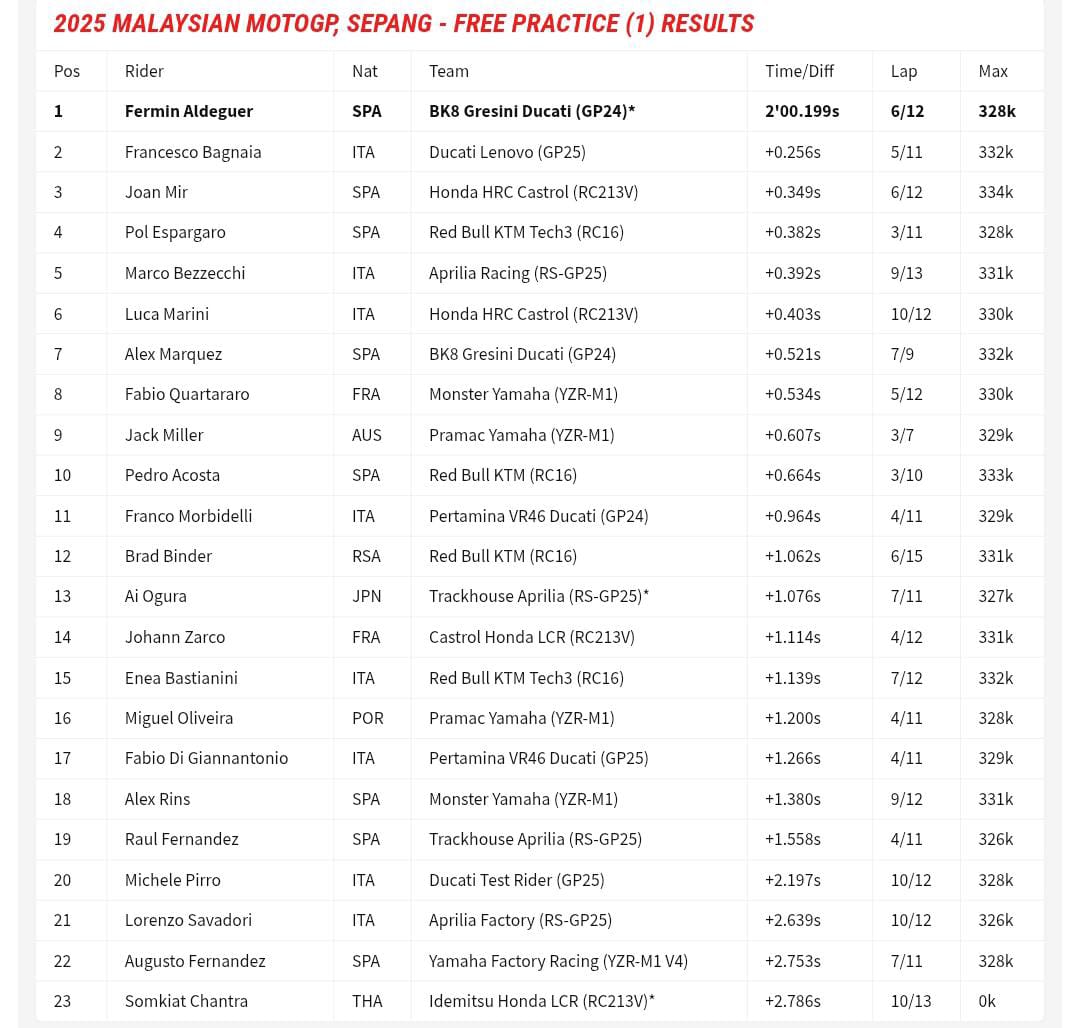 Pebalap muda asal Spanyol itu menorehkan catatan waktu yang cukup cepat dan unggul 0,256 detik dari Francesco Bagnaia yang berada di posisi kedua. Aldeguer dan Bagnaia sama-sama menggunakan kombinasi ban medium di depan dan belakang, menunjukkan keseimbangan performa yang konsisten di lintasan yang kala itu masih kering.