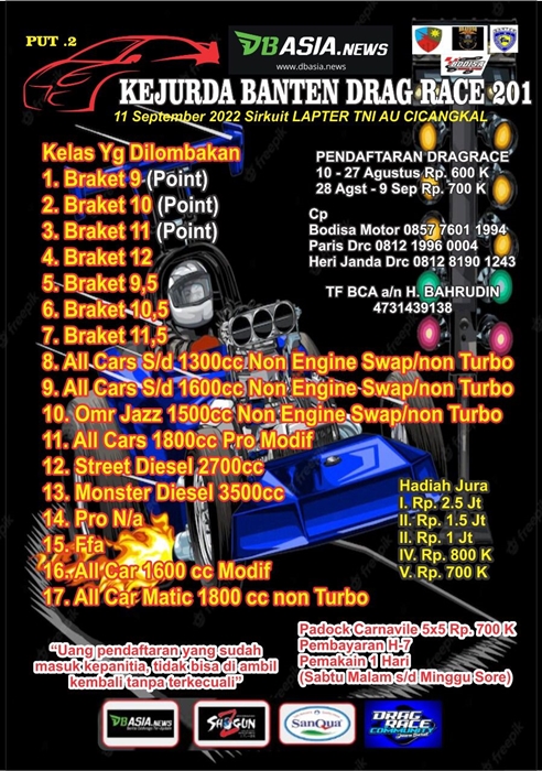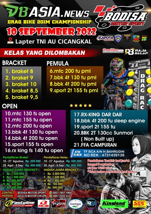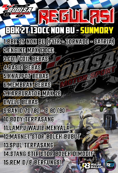 Menariknya di balapan drag bike, ada satu kelas baru yang fenomenal. Bebek 2Tak 130cc Sunmori Non BU. Pensaran seperti apa regulasinya? Simak di bawah ini, sekaligus informasi lengkap lainnya. Hubungi kontak yang tersedia, jika ada pertanyaan dan sejenisnya.