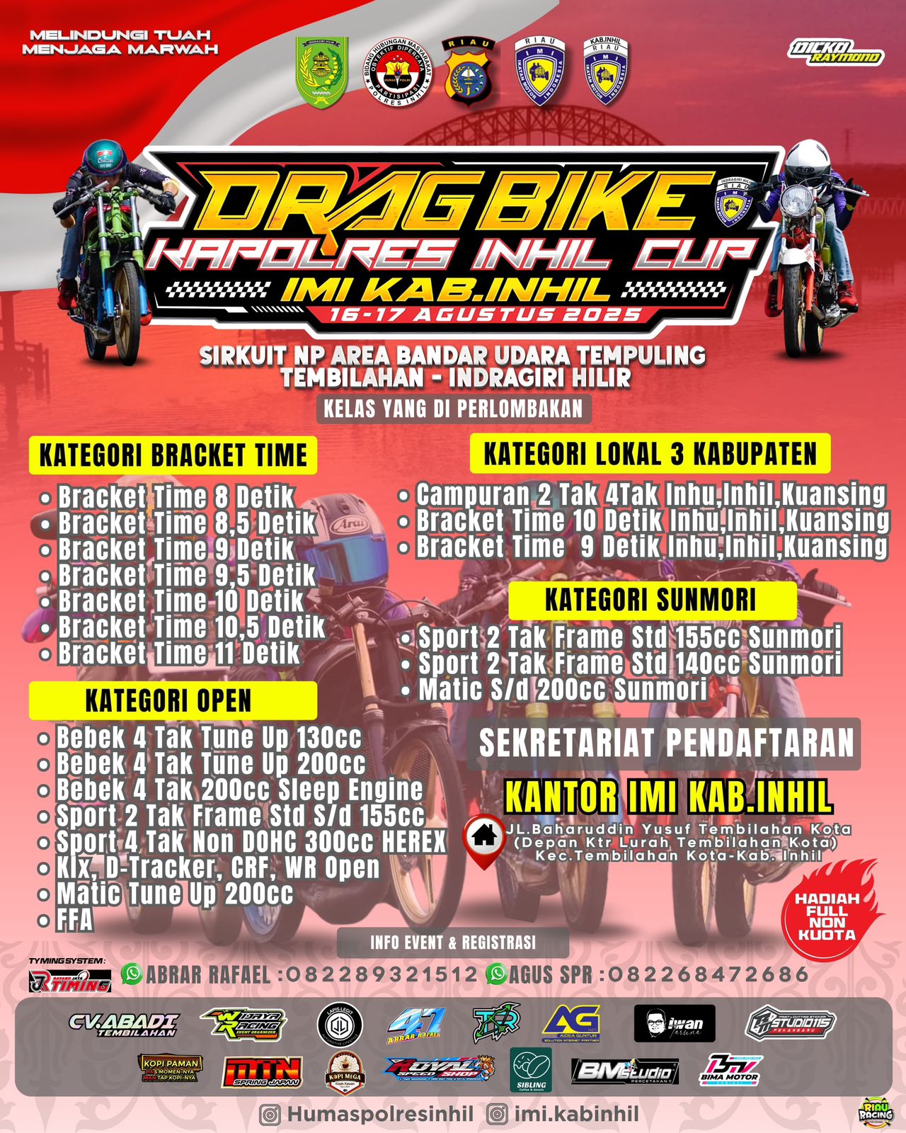 OtomotifZone.com – Indragiri Hilir. Ajang balap lurus paling bergengsi di Kabupaten Indragiri Hilir, Drag Bike Kapolres Inhil Cup 2025, siap menghentak Sirkuit NP Area Bandar Udara Tempuling, Tembilahan – Indragiri Hilir pada 16-17 Agustus 2025. Event ini digelar oleh IMI Kabupaten Inhil dengan dukungan penuh Kapolres Inhil, sekaligus menjadi magnet bagi pembalap-pembalap cepat dari berbagai daerah.