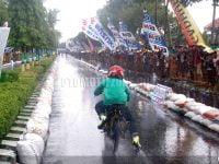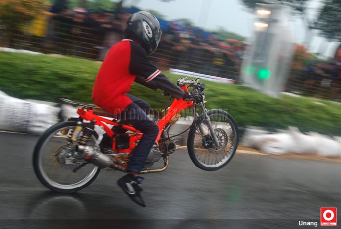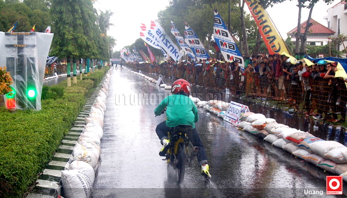OtomotifZone.com – Slawi. Dragbike garapan EO Gaduro Sport di sirkuit jalan Gajah mada (24/1) berlangsung dalam kondisi hujan. Walau begitu perebutan juara umum untuk mendapatkan sebuah sepeda motor cukup ketat dan seru. Dijejali 485 stater mulai dari pebalap anyar hingga ngetop tumplek blek di Slawi. Nama nama tenar seperti Eko Codox, Niko Sakau, Dwi Batang, Bayu Ucil, Niko Sakau, Rully PM, Jhon PK, Ari Madun, Kiki Codet Nampak antusias, maklum hadiah utamanya memang cukup menggiurkan. Bahkan pebalap lawas VPM botet asal Jogja yang sudah lama tidak balap juga ikutan pula.