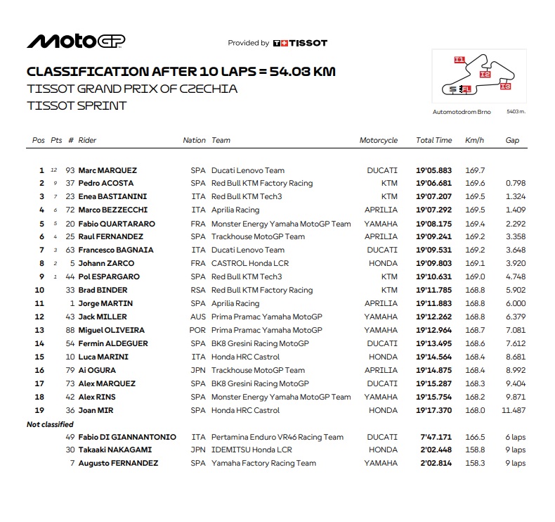 OtomotifZone.com – Ceko. Drama kembali terjadi pada Sprint Race MotoGP Brno, Cekoslovakia 19 Juli 2025. Kembali Marc memenangkan balapan separuh race utama tersebut. Pembalap Spanyol ini membuat drama cukup cerdas soal aturan yang cukup membingungkan tentang tekanan ban. Marc mengatur agar ban tidak mengalami penurunan tekanan.