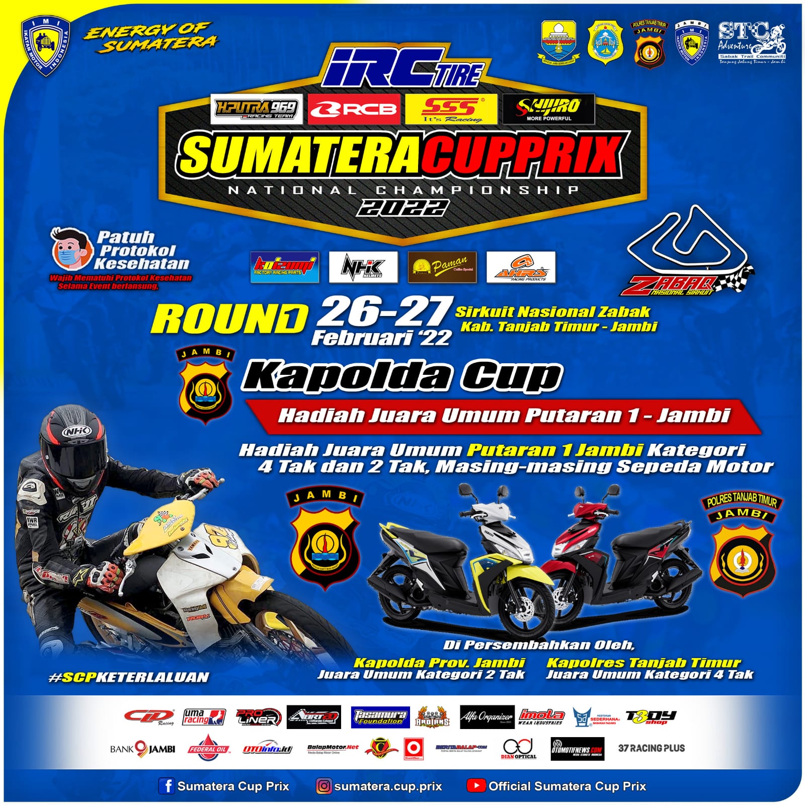 OtomotifZone.com – Jambi. Memang keterlaluan event Sumatera Cup Prix. Kali ini tingkat keterlaluan mulai kumat sejak putaran pertama (26-27/2/22) di Sirkuit Zabak, Kab. Tanjab Timur, Jambi. Dua unit motor sudah disiapkan untuk Juara Umum putaran pertama. Dua Unit motor ini dipersembahkan dari Kapolda Provinsi Jambi dan Kapolres Tanjab Timur.