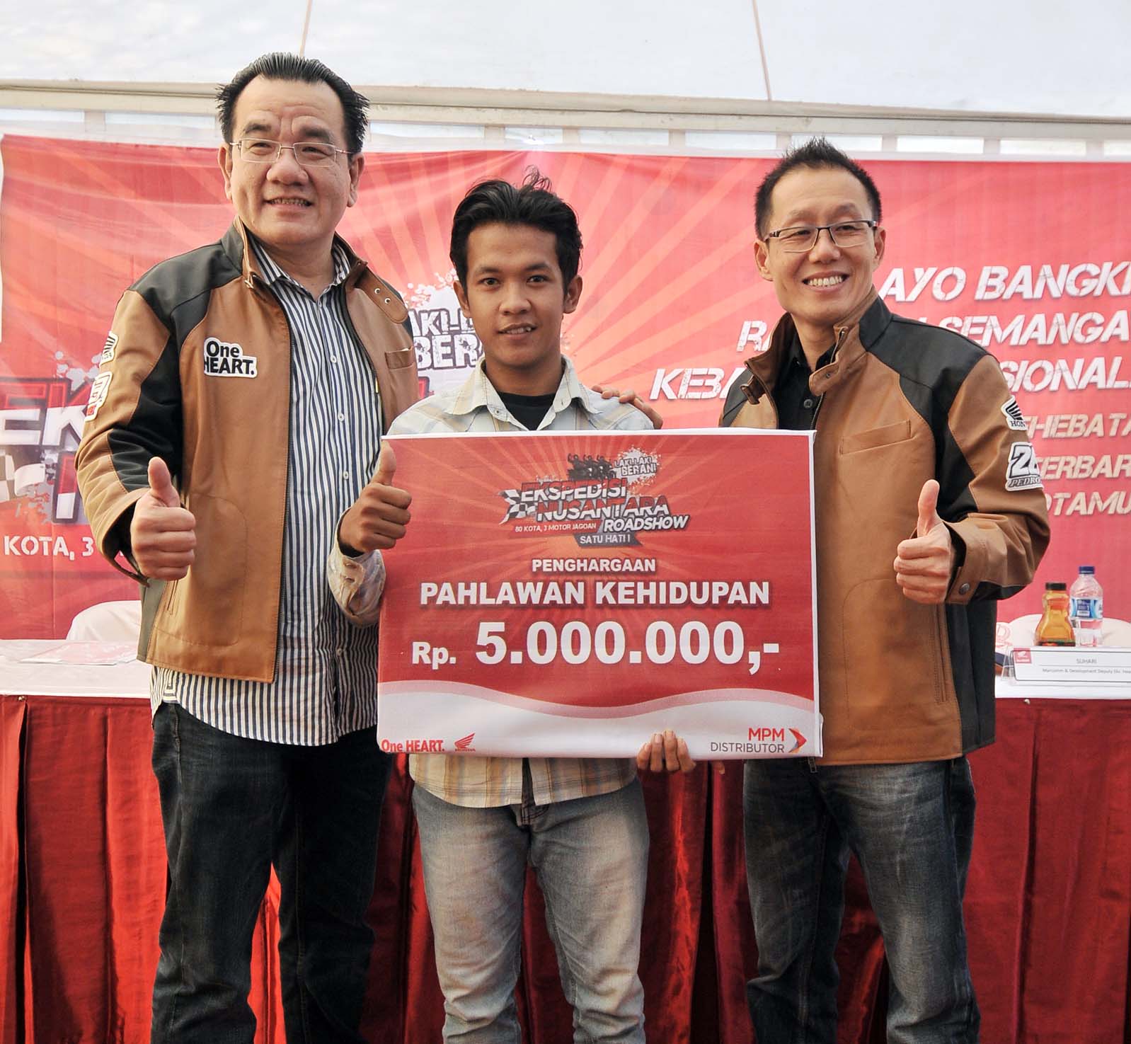 Hal senada juga diamini oleh Suhari, Marcomm Dept Division MPM Motor. “Pada even kali ini masyarakat dapat berinteraksi langsung dengan 3 motor sport Honda yang dipakai touring yakni : Honda CB150R Streetfire, Honda Verza 150, dan New Honda MegaPro FI. Ketangguhan ketiga model ini telah dibuktikan melalui perjalanan sejauh 8.233 km dalam kegiatan touring Ekspedisi Nusantara Satu Hati Untuk Negeri yang berlangsung awal tahun ini. Selain itu kami juga mengahadirkan pejuang kehidupan yang dapat memberikan inspirasi kepada kita dan kami memberikan donasi kepadanya.”
