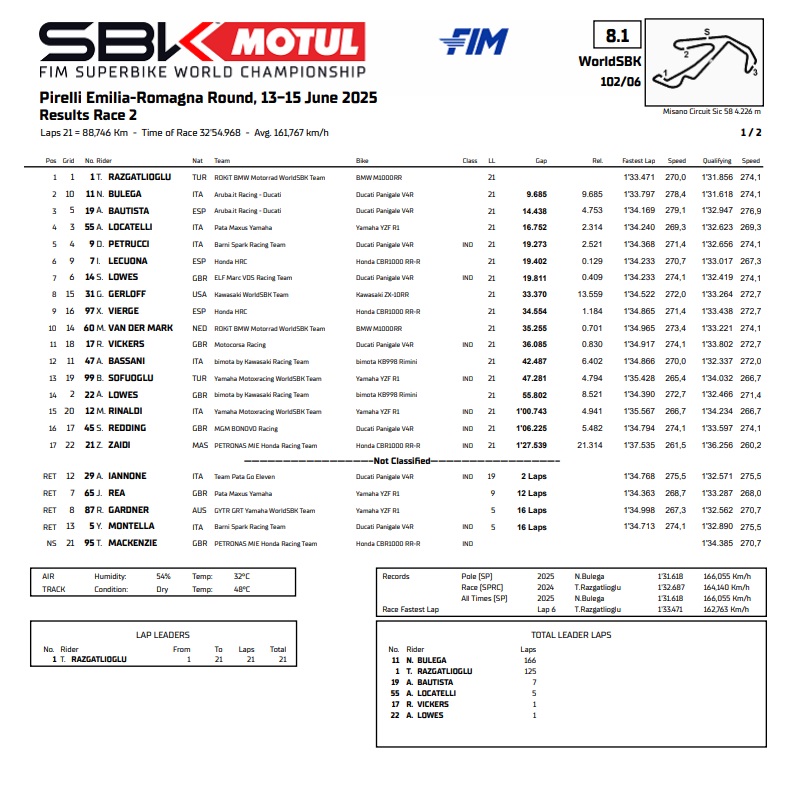 Setelah Superpole Race tadi jarak poin mereka mendekat 12 angka setelah Bulega terjatuh dengan Axel Basani memaksanya tak membawa poin sama sekali di superpole race. Proges perjuangan Toprak merebut point untuk kembali memimpin klasemen sebelum dia meninggalkan WorldSBK tahun ini.
