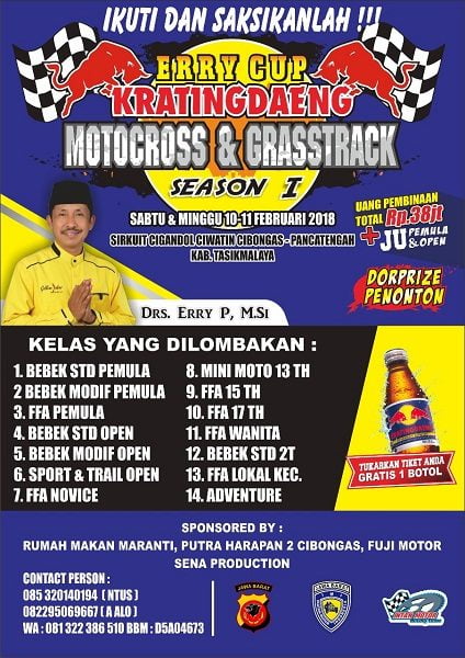 OtomotifZone.com – Kab. Tasikmalaya. Kabupaten Tasikmalaya bakal dihebohkan dengan gelaran balap garuk tanah akhir pekan ini. Bertajuk Erry Cup Kratingdaeng Motocross & Grasstrack akan digelar Sabtu dan Minggu (10-11/02) di sirkuit Cigandol Ciwatin Cibongas, Pancatengah, Kab. Tasikmalaya.