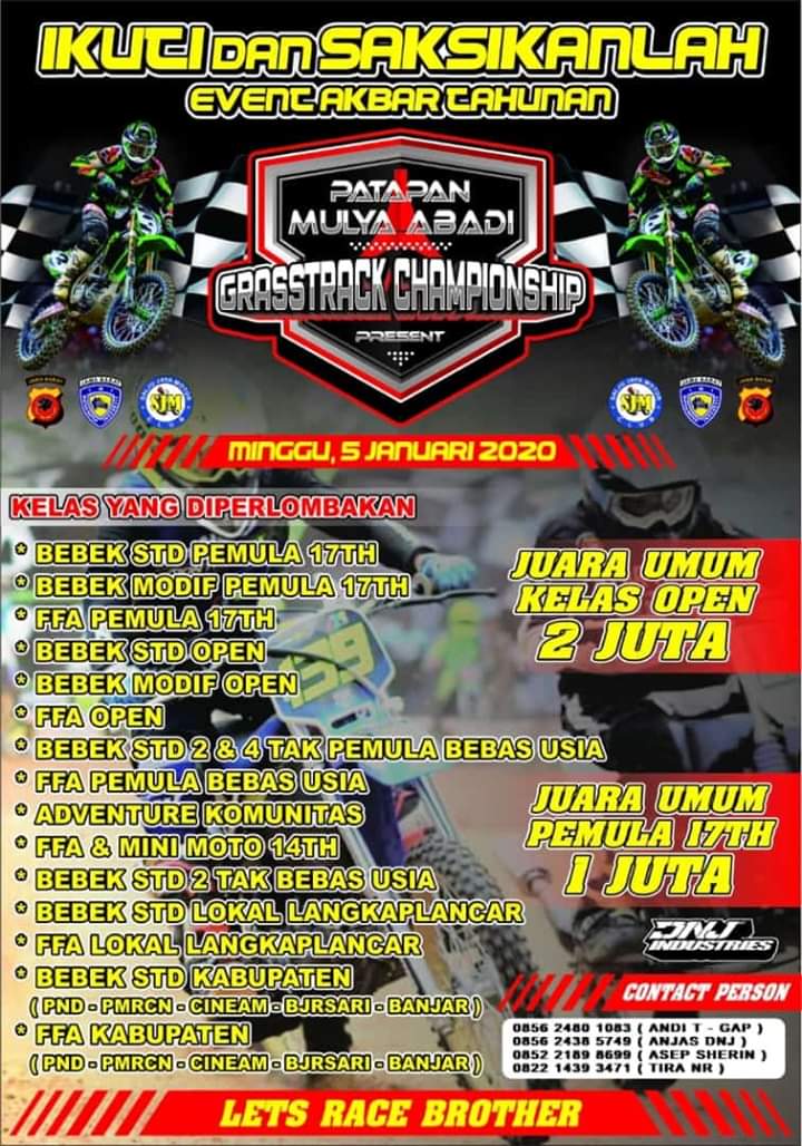 OtomotifZone.com – Pangandaran. Event tahunan yang rutin dihelat tiap awal tahun ini kembali digelar, gelaran bertitel Patapan Mulya Abadi Grasstrack Championship akan berlangsung pada Hari Minggu (05/01). Sirkuit Patapan Indah Langkaplancar Pangandaran Jawa Barat akan menjadi tempat bertarungnya para pembalap grasstrack.