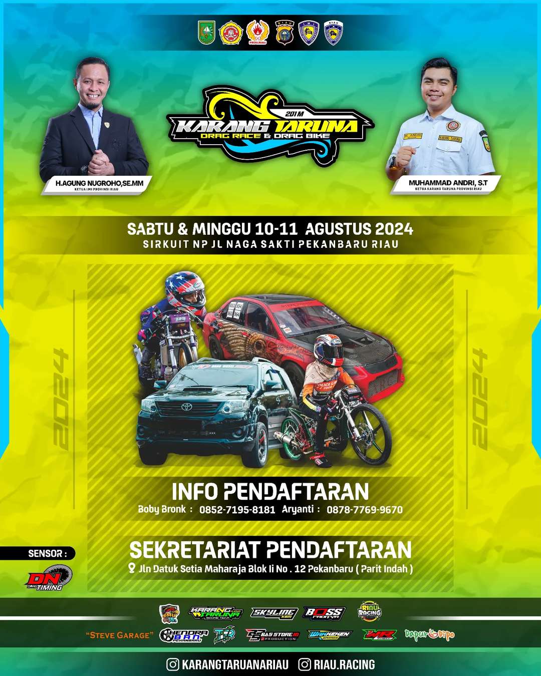 OtomotifZone.com-Riau. Setelah melakukan kordinasi antara IMI Riau dan ketua H Agung Nugroho, Hajatan event ” Karang Taruna Drag Race & Drag Bike 201m” Yang diadakan pada tanggal 10 – 11 Agustus 2024 ini bertempat di sirkuit Np Naga Sakti Pekan baru, yang langsung di komandoi oleh Muhammad Andri S.T selaku ketua karang taruna provinsi Riau. Dalam event ini karang taruna provinsi riau menunjuk @riauracing untuk mengatur dan melaksanakan event tersebut sekaligus mempercayakan DN drag timming untuk pencatatan waktu.