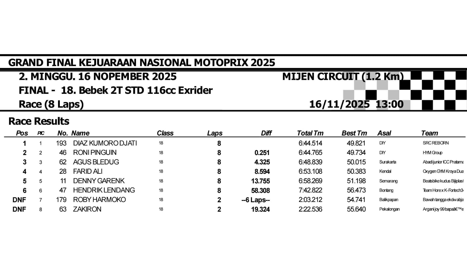 OtomotifZone.com – Semarang. Gelaran Grand Final Kejurnas Motoprix 2025 di Sirkuit Mijen (1,2 km) kembali menyuguhkan persaingan ketat pada kelas Bebek 2T STD 116cc Exrider. Di kelas penuh gengsi ini, F1ZR garapan Rudi Febrianto, atau yang akrab disapa Salecong dari Pacitan, Jawa Timur, tampil menggila dan sukses mengantarkan rider andalannya, Diaz Kumorojati, meraih kemenangan mutlak.