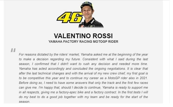Seperti kata yang tertera di atas option bagi Rossi tak serta merta di buang begitu saja. Masih ada motor spek pabrikan untuknya. Inti kutipan rilis yang di keluarkan Rossi berisi tujuan dia untuk kompetitif tahun ini dan untuk melanjutkan karir sebagai pembalap MotoGP juga pada tahun 2021. Rossi memutuskan untuk melanjutkan, Yamaha siap mendukung dalam segala hal termasuk kontrak dan spek motor factory.