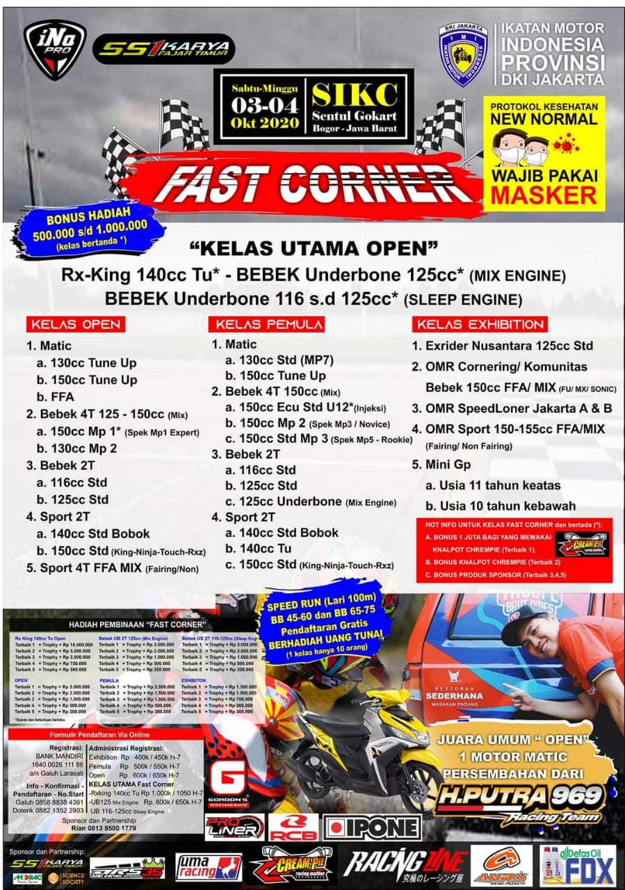 OtomotifZone.com – Jakarta. Sekedar untuk mengingatkan kembali jika di awal bulan Oktober nanti akan ada event balap bertajuk Fast Corner yang berlangsung akan bergulir di Sentul International Karting Circuit (SIKC), atau akrab di sebut Sentul Kecil, di Bogor, Jawa Barat, (3-4/10) mendatang. Pada ajang kali ini akan banyak sekali kelas yang diperlombakan dan tentu saja dengan hadiah besar dan berlimpah yang telah disediakan oleh penyelenggara.