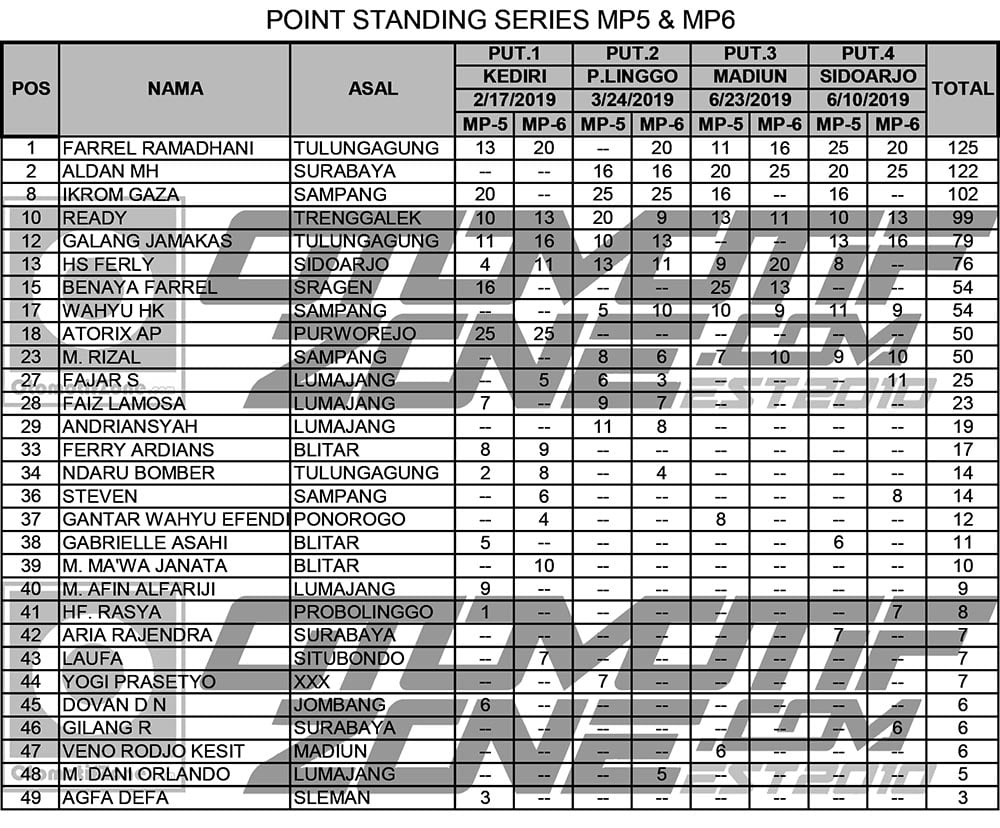 Di kelas Motoprix MP5 dan MP6 terjadi pergeseran podium juaranya. Saat di seri kota Probolinggo Ikrom Gaza asal Sampang unggul dengan perkuat tim Gazslor Tulungagung. Kali ini berpindah ke Farrel Ramadhani tim Honda MPM Shakespeare 45 Lamongan, disusul Aldan MH diperingkat ke 3. Meski Farrel dipuncak klasemen sementara di kelas rookie namun di Rookie MP6 Aldan lebih dahulu injak garis finis. “ Faktor motor yang memang kalah kencang “ sesal Farrel .