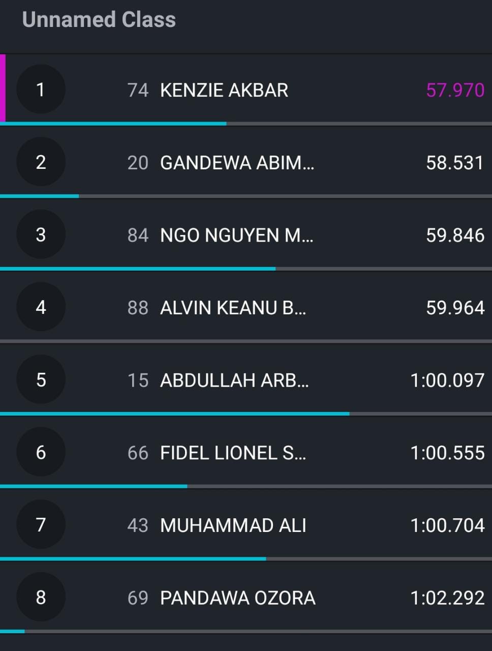 Meskipun tidak menonjol dalam sesi latihan resmi, Kenzie mampu memberikan kejutan dengan mencatatkan waktu yang sangat cepat. Waktu putaran 57.970 detik menunjukkan kemampuannya yang luar biasa di lintasan ini, dan pesaing lain tidak mampu mengejar waktu tersebut.
